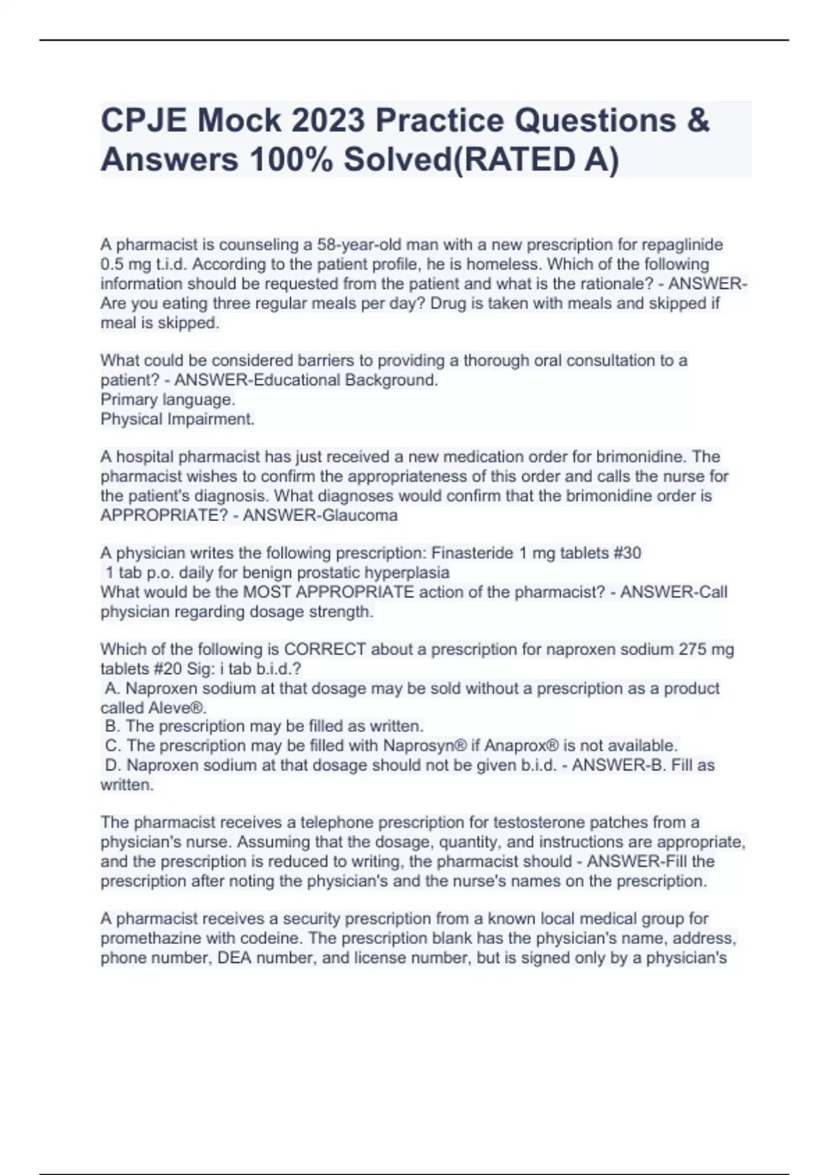 A pharmacist is counseling a 58-year-old man with a new prescription for repaglinide 0.5 mg t.i.d. According to the patient profile, he is homeless. Which of the following information should be requested from the patient and what is the rationale? - ANSWER-Are you eating three regular meals per day? Drug is taken with meals and skipped if meal is skipped. What could be considered barriers to providing a thorough oral consultation to a patient? - ANSWER-Educational Background. Primary language. Physical Impairment. A hospital pharmacist has just received a new medication order for brimonidine. The pharmacist wishes to confirm the appropriateness of this order and calls the nurse for the patient's diagnosis. What diagnoses would confirm that the brimonidine order is APPROPRIATE? - ANSWER-Glaucoma A physician writes the following prescription: Finasteride 1 mg tablets #30 1 tab p.o. daily for benign prostatic hyperplasia What would be the MOST APPROPRIATE action of the pharmacist? - ANSWER-Call physician regarding dosage strength. Which of the following is CORRECT about a prescription for naproxen sodium 275 mg tablets #20 Sig: i tab b.i.d.? A. Naproxen sodium at that dosage may be sold without a prescription as a product called Aleve®. B. The prescription may be filled as written. C. The prescription may be filled with Naprosyn® if Anaprox® is not available. D. Naproxen sodium at that dosage should not be given b.i.d. - ANSWER-B. Fill as written. The pharmacist receives a telephone prescription for testosterone patches from a physician's nurse. Assuming that the dosage, quantity, and instructions are appropriate, and the