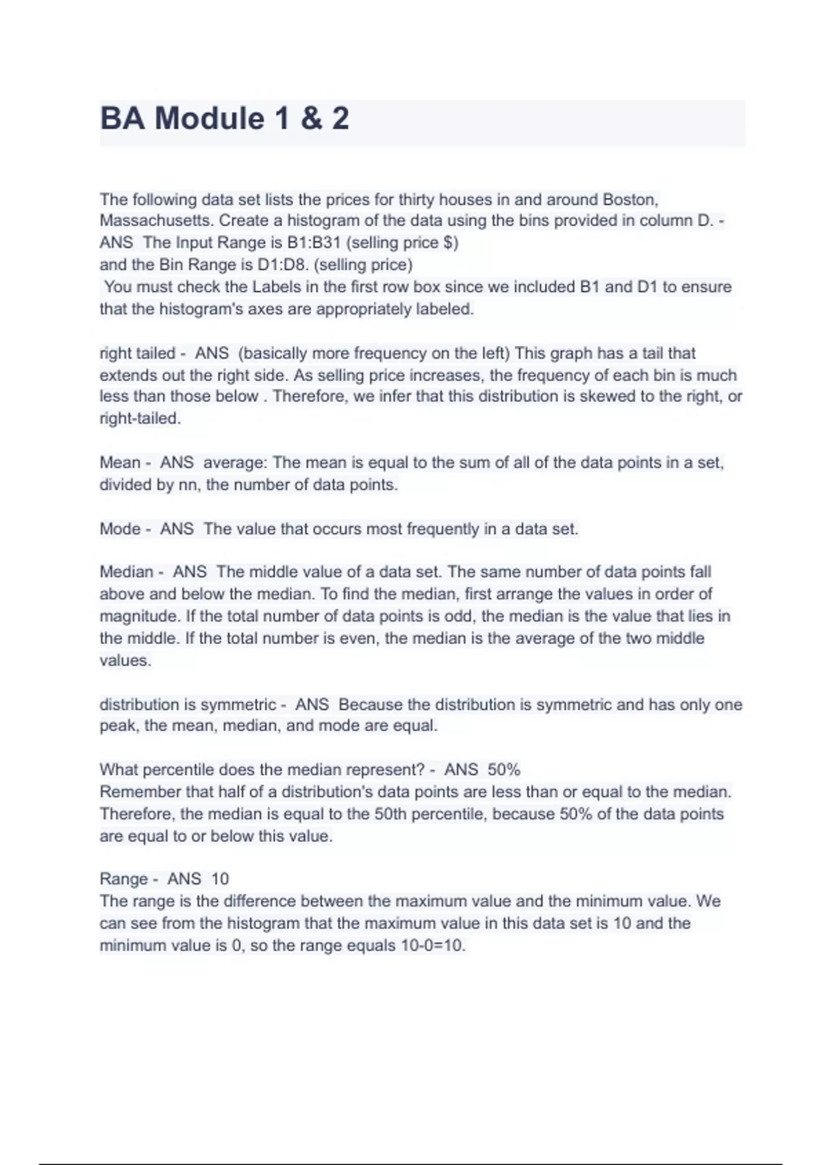 BA Module 1 & 2 The following data set lists the prices for thirty houses in and around Boston, Massachusetts. Create a histogram of the data using the bins provided in column D. - ANS The Input Range is B1:B31 (selling price $) and the Bin Range is D1:D8. (selling price) You must check the Labels in the first row box since we included B1 and D1 to ensure that the histogram's axes are appropriately labeled. right tailed - ANS (basically more frequency on the left) This graph has a tail that extends out the right side. As selling price increases, the frequency of each bin is much less than those below . Therefore, we infer that this distribution is skewed to the right, or right-tailed. Mean - ANS average: The mean is equal to the sum of all of the data points in a set, divided by nn, the number of data points. Mode - ANS The value that occurs most frequently in a data set. Median - ANS The middle value of a data set. The same number of data points fall above and below the median. To find the median, first arrange the values in order of magnitude. If the total number of data points is odd, the median is the value that lies in the middle. If the total number is even, the median is the average of the two middle values. distribution is symmetric - ANS Because the distribution is symmetric and has only one peak, the mean, median, and mode are equal. What percentile does the median represent? - ANS 50% Remember that half of a distribution's data points are less than or equal to the median. Therefore, the median is equal to the 50th percentile, because 50% of the data points are equal to or below this value. Range - ANS 10 The range is the difference between the maximum value and the minimum value. We can see from the histogram that the maximum value in this data set is 10 and the minimum value is 0, so the range equals 10-0=10. standard deviation - ANS measure of the amount of variation or dispersion of a set of values. A low standard deviation indicates that the values tend to be close to the mean of the set, while a high standard deviation indicates that the values are spread out over a wider range. If the variance of a data set is 9, what is the standard deviation? - ANS 3 The standard deviation is equal to the square root of the variance. If the variance is 9, then the standard deviation must be 3. If two data sets, A and B, have equal standard deviations, which of the following statements is true? Select all that apply. - ANS The variance of A must equal the variance of B