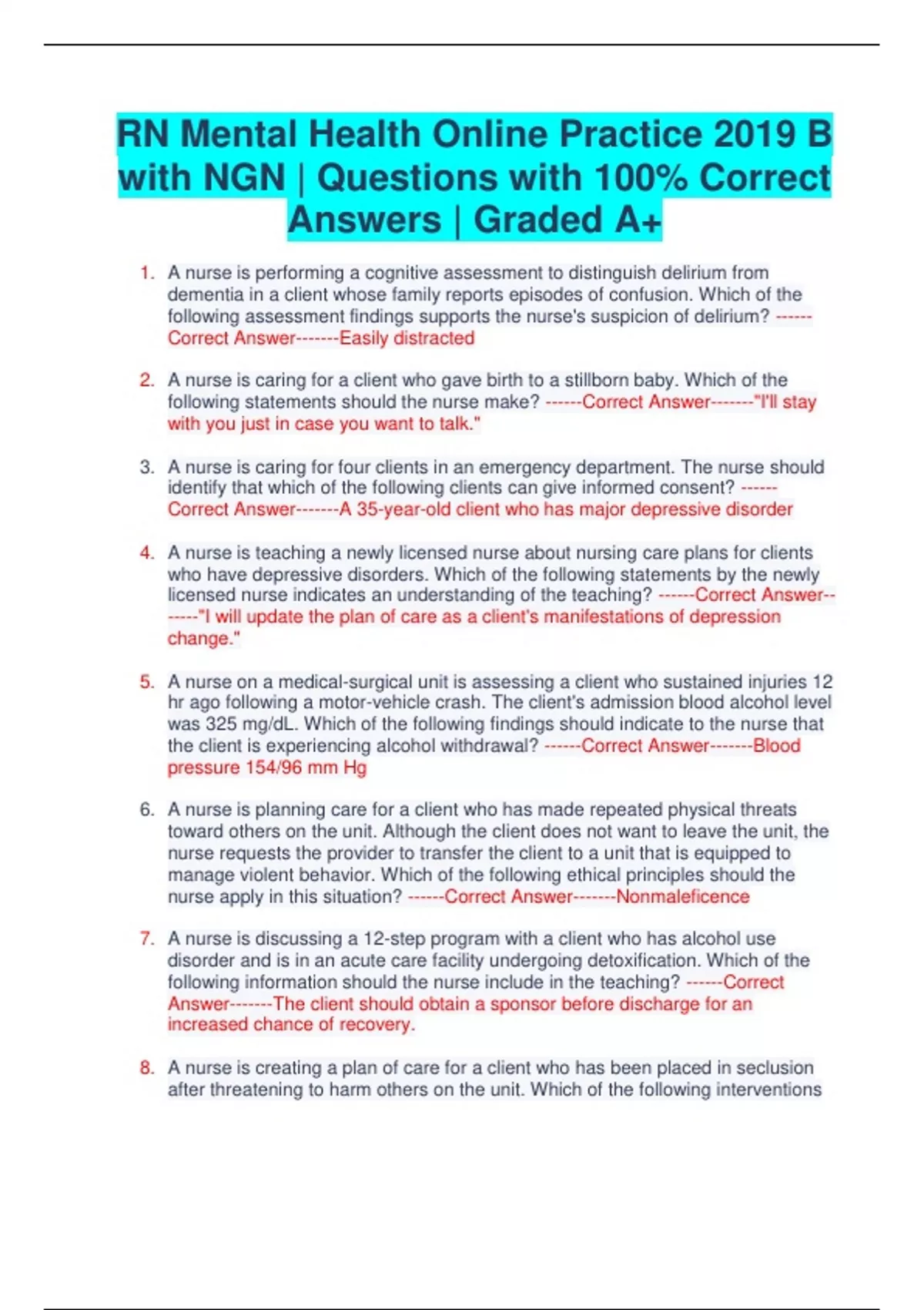 RN Mental Health Online Practice 2019 B with NGN | Questions with 100% Correct Answers | Graded A+ 1. A nurse is performing a cognitive assessment to distinguish delirium from dementia in a client whose family reports episodes of confusion. Which of the following assessment findings supports the nurse's suspicion of delirium? ------ Correct Answer-------Easily distracted 2. A nurse is caring for a client who gave birth to a stillborn baby. Which of the following statements should the nurse make? ------Correct Answer-------"I'll stay with you just in case you want to talk." 3. A nurse is caring for four clients in an emergency department. The nurse should identify that which of the following clients can give informed consent? ------ Correct Answer-------A 35-year-old client who has major depressive disorder 4. A nurse is teaching a newly licensed nurse about nursing care plans for clients who have depressive disorders. Which of the following statements by the newly licensed nurse indicates an understanding of the teaching? ------Correct Answer-- -----"I will update the plan of care as a client's manifestations of depression change." 5. A nurse on a medical-surgical unit is assessing a client who sustained injuries 12 hr ago following a motor-vehicle crash. The client's admission blood alcohol level was 325 mg/dL. Which of the following findings should indicate to the nurse that the client is experiencing alcohol withdrawal? ------Correct Answer-------Blood pressure 154/96 mm Hg