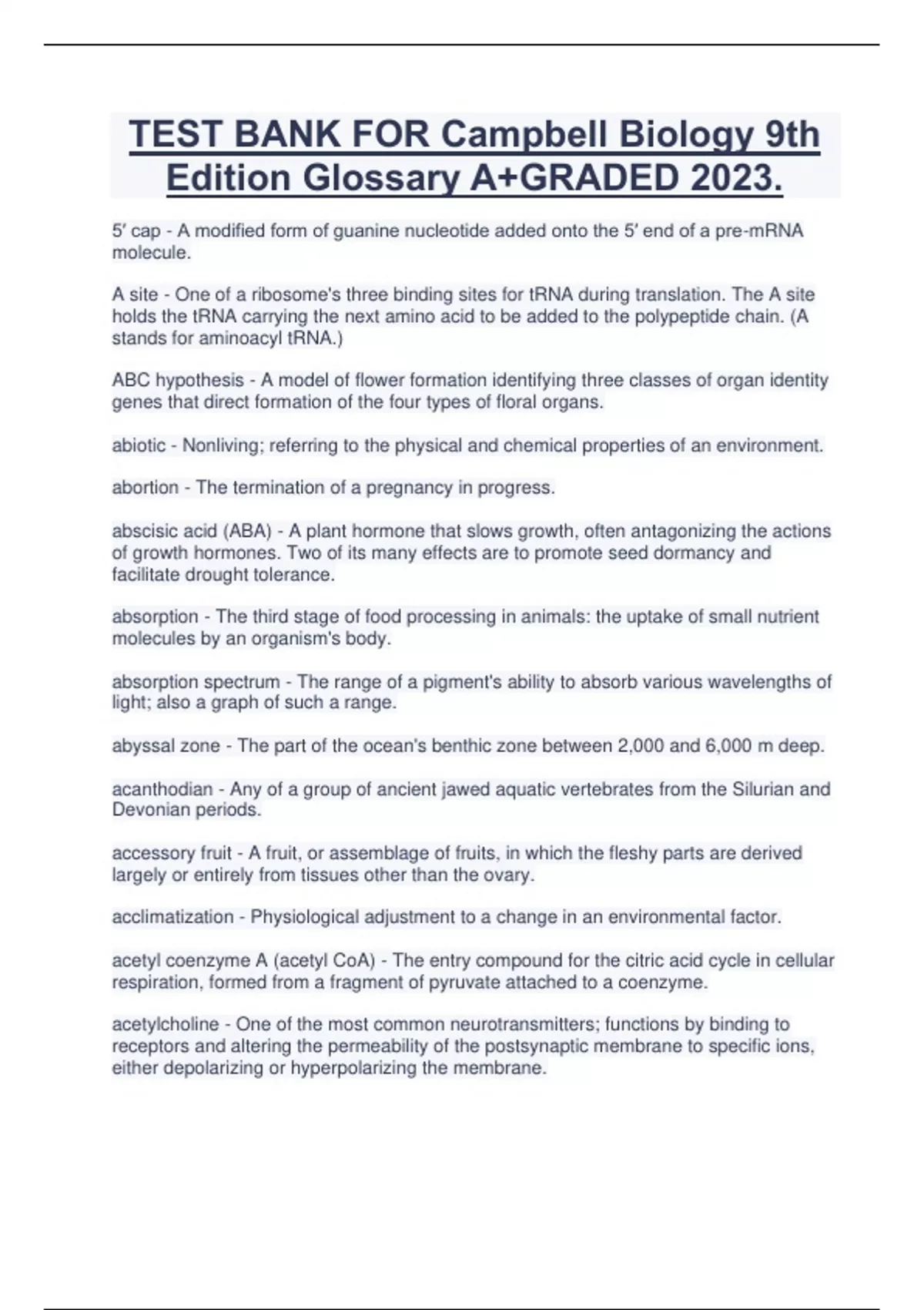 TEST BANK FOR Campbell Biology 9th Edition Glossary A+GRADED 2023. 5′ cap - A modified form of guanine nucleotide added onto the 5′ end of a pre-mRNA molecule. A site - One of a ribosome's three binding sites for tRNA during translation. The A site holds the tRNA carrying the next amino acid to be added to the polypeptide chain. (A stands for aminoacyl tRNA.) ABC hypothesis - A model of flower formation identifying three classes of organ identity genes that direct formation of the four types of floral organs. abiotic - Nonliving; referring to the physical and chemical properties of an environment. abortion - The termination of a pregnancy in progress. abscisic acid (ABA) - A plant hormone that slows growth, often antagonizing the actions of growth hormones. Two of its many effects are to promote seed dormancy and facilitate drought tolerance. absorption - The third stage of food processing in animals: the uptake of small nutrient molecules by an organism's body. absorption spectrum - The range of a pigment's ability to absorb various wavelengths of light; also a graph of such a range. abyssal zone - The part of the ocean's benthic zone between 2,000 and 6,000 m deep. acanthodian - Any of a group of ancient jawed aquatic vertebrates from the Silurian and Devonian periods. accessory fruit - A fruit, or assemblage of fruits, in which the fleshy parts are derived largely or entirely from tissues other than the ovary. acclimatization - Physiological adjustment to a change in an environmental factor. acetyl coenzyme A (acetyl CoA) - The entry compound for the citric acid cycle in cellular respiration, formed from a fragment of pyruvate attached to a coenzyme. acetylcholine - One of the most common neurotransmitters; functions by binding to receptors and altering the permeability of the postsynaptic membrane to specific ions, either depolarizing or hyperpolarizing the membrane.