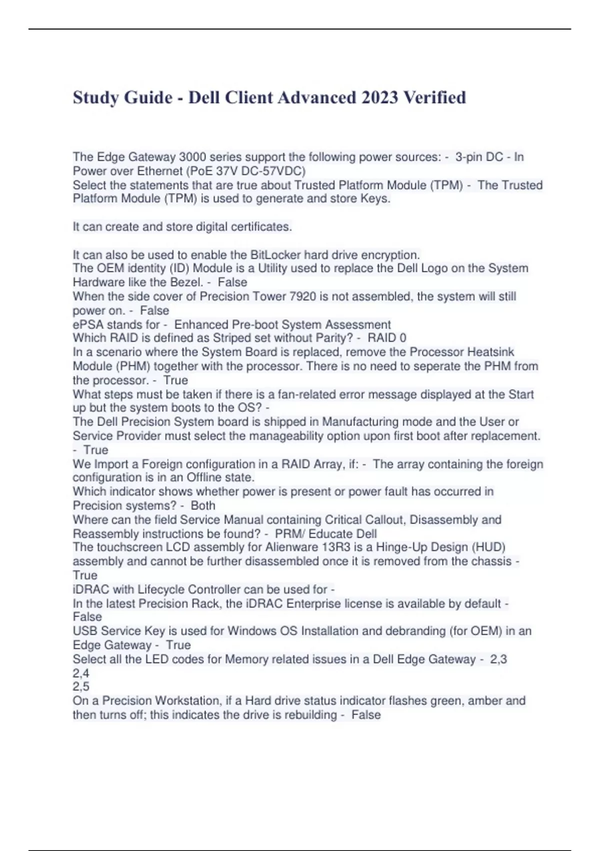 Study Guide - Dell Client Advanced 2023 Verified The Edge Gateway 3000 series support the following power sources: - 3-pin DC - In Power over Ethernet (PoE 37V DC-57VDC) Select the statements that are true about Trusted Platform Module (TPM) - The Trusted Platform Module (TPM) is used to generate and store Keys. It can create and store digital certificates. It can also be used to enable the BitLocker hard drive encryption. The OEM identity (ID) Module is a Utility used to replace the Dell Logo on the System Hardware like the Bezel. - False When the side cover of Precision Tower 7920 is not assembled, the system will still power on. - False ePSA stands for - Enhanced Pre-boot System Assessment Which RAID is defined as Striped set without Parity? - RAID 0 In a scenario where the System Board is replaced, remove the Processor Heatsink Module (PHM) together with the processor. There is no need to seperate the PHM from the processor. - True What steps must be taken if there is a fan-related error message displayed at the Start up but the system boots to the OS? - The Dell Precision System board is shipped in Manufacturing mode and the User or Service Provider must select the manageability option upon first boot after replacement. - True We Import a Foreign configuration in a RAID Array, if: - The array containing the foreign configuration is in an Offline state. Which indicator shows whether power is present or power fault has occurred in Precision systems? - Both Where can the field Service Manual containing Critical Callout, Disassembly and Reassembly instructions be found? - PRM/ Educate Dell The touchscreen LCD assembly for Alienware 13R3 is a Hinge-Up Design (HUD) assembly and cannot be further disassembled once it is removed from the chassis - True iDRAC with Lifecycle Controller can be used for - In the latest Precision Rack, the iDRAC Enterprise license is available by default - False USB Service Key is used for Windows OS Installation and debranding (for OEM) in an Edge Gateway - True Select all the LED codes for Memory related issues in a Dell Edge Gateway - 2,3 2,4 2,5 On a Precision Workstation, if a Hard drive status indicator flashes green, amber and then turns off; this indicates the drive is rebuilding - False A CAN (Controller Area Network) bus is a vehicle bus standard designed to allow micro controllers and devices to communicate with each other in applications without a host computer. - True In a PERC H730P controller, P stands for Performance - True DPK stands for - Digital Product Key After completing a service incident on a Precision Tower 7920, technician attempts to run ePSA before re-assembling the side cover. However, system is not able to power on and displays LED error code of 4-7. What could be the issue? - The intrusion switch is triggered and power is cut-off. Install the side cover to de-activate the intrusion switch. In general, an Anti-Static Mat is used to prevent Electrostatic damage - True Select all the guidelines that have been followed when working in a Data Center Environment - Only access racks that that contain the equipment you are assigned to troubleshoot. Communicate any problems to the Data Center staff. No food or drinks allowed in the Data Center. Which screwdriver is recommended for removing PHM (Processor Heat Sink module) used on a Precision Rack 7920? - Torx #T30 On Latitude 14 Rugged Extreme - 7414, which light is used to communicate error using single LED? - Battery Light