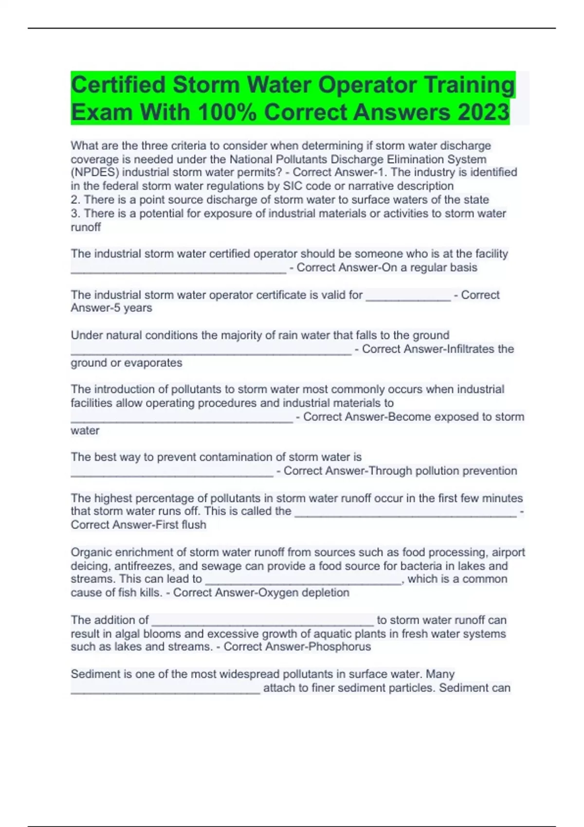 Certified Storm Water Operator Training Exam With 100% Correct Answers 2023
