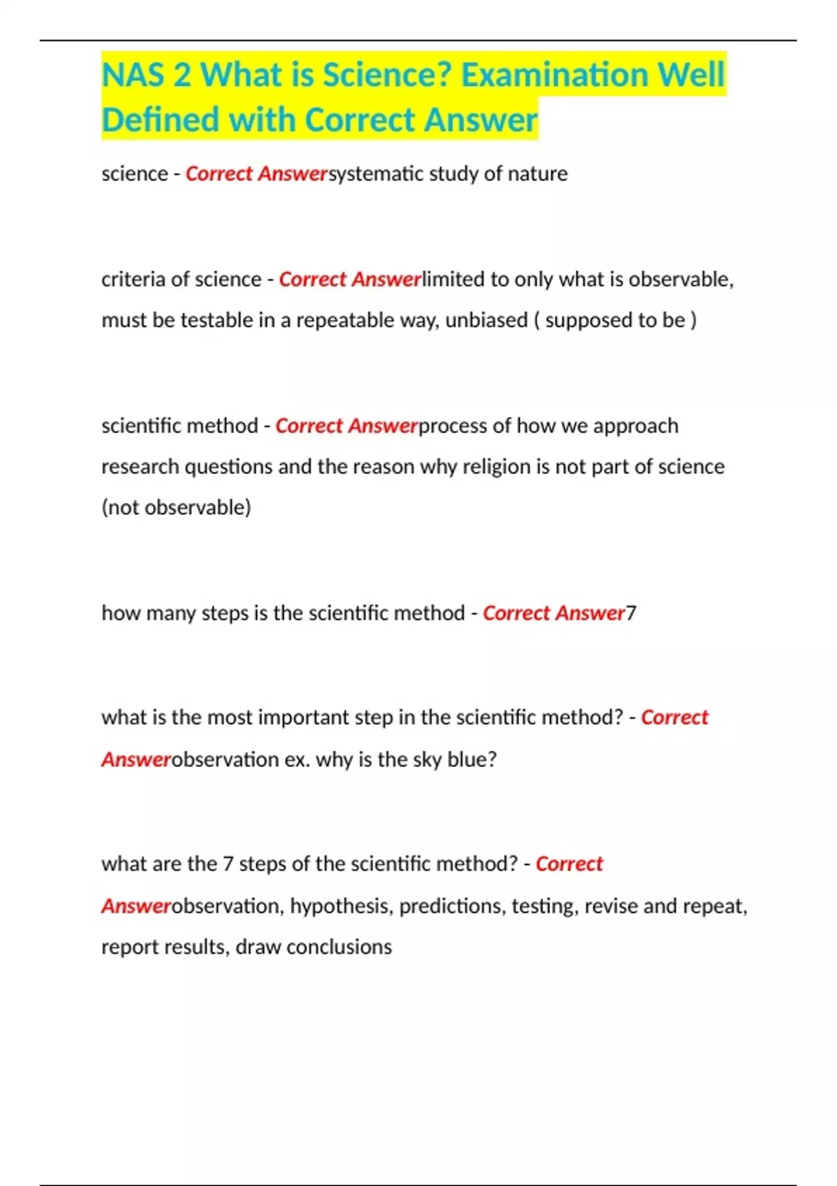 NAS 2 What is Science? Examination Well Defined with Correct Answer