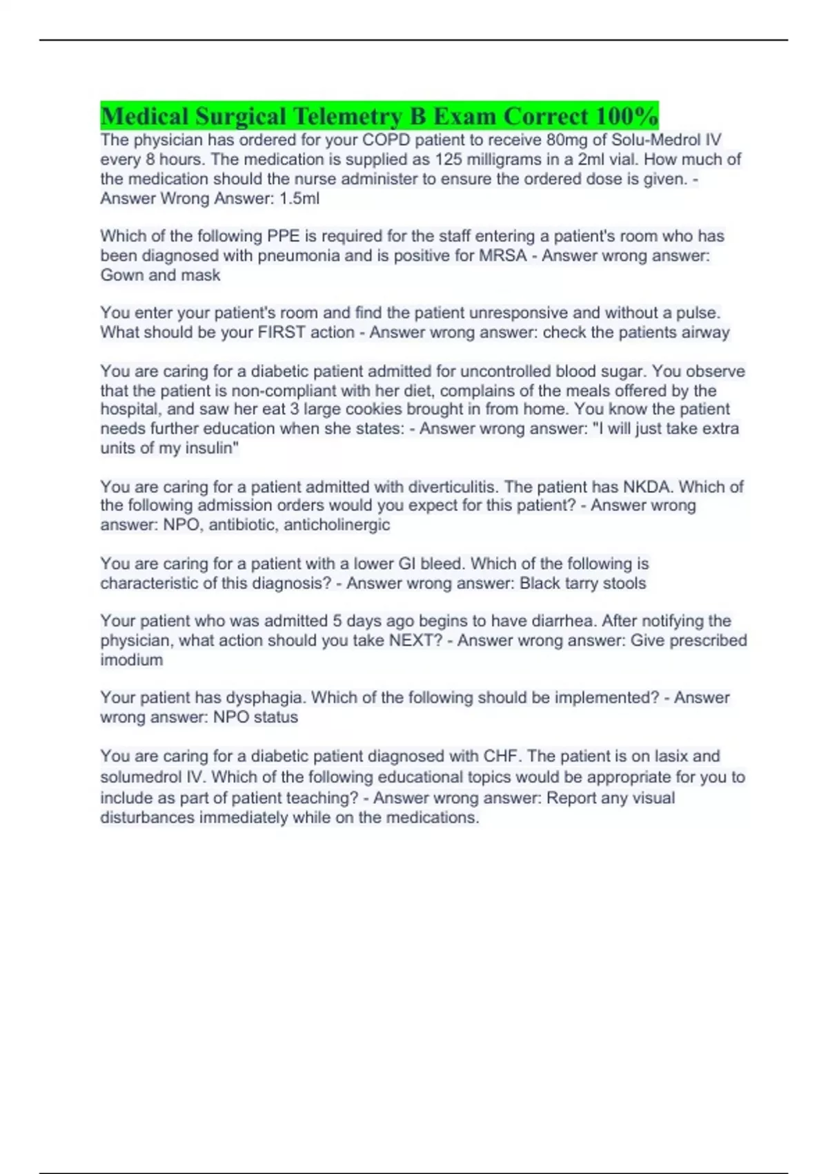 The physician has ordered for your COPD patient to receive 80mg of Solu-Medrol IV every 8 hours. The medication is supplied as 125 milligrams in a 2ml vial. How much of the medication should the nurse administer to ensure the ordered dose is given. - Answer Wrong Answer: 1.5ml Which of the following PPE is required for the staff entering a patient's room who has been diagnosed with pneumonia and is positive for MRSA - Answer wrong answer: Gown and mask You enter your patient's room and find the patient unresponsive and without a pulse. What should be your FIRST action - Answer wrong answer: check the patients airway You are caring for a diabetic patient admitted for uncontrolled blood sugar. You observe that the patient is non-compliant with her diet, complains of the meals offered by the hospital, and saw her eat 3 large cookies brought in from home. You know the patient needs further education when she states: - Answer wrong answer: "I will just take extra units of my insulin" You are caring for a patient admitted with diverticulitis. The patient has NKDA. Which of the following admission orders would you expect for this patient? - Answer wrong answer: NPO, antibiotic, anticholinergic You are caring for a patient with a lower GI bleed. Which of the following is characteristic of this diagnosis? - Answer wrong answer: Black tarry stools Your patient who was admitted 5 days ago begins to have diarrhea. After notifying the physician, what action should you take NEXT? - Answer wrong answer: Give prescribed imodium Your patient has dysphagia. Which of the following should be implemented? - Answer wrong answer: NPO status You are caring for a diabetic patient diagnosed with CHF. The patient is on lasix and solumedrol IV. Which of the following educational topics would be appropriate for you to include as part of patient teaching? - Answer wrong answer: Report any visual disturbances immediately while on