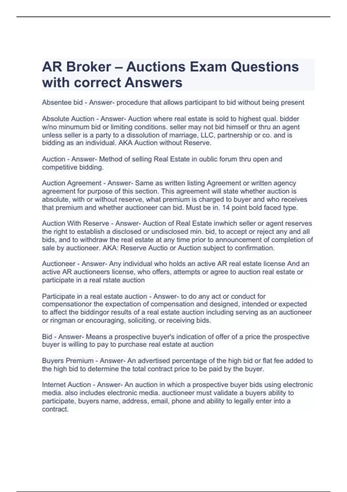 AR Broker – Auctions Exam Questions with correct Answers