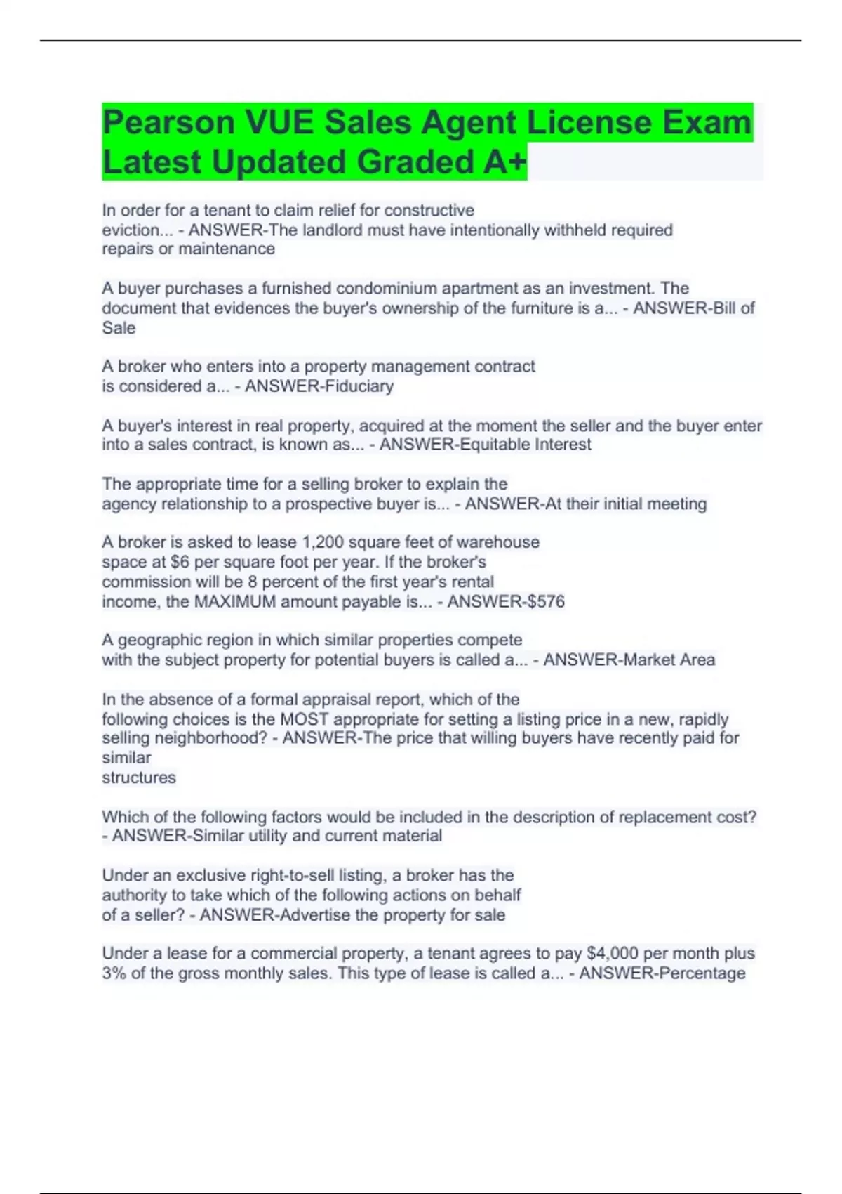 In order for a tenant to claim relief for constructive eviction... - ANSWER-The landlord must have intentionally withheld required repairs or maintenance A buyer purchases a furnished condominium apartment as an investment. The document that evidences the buyer's ownership of the furniture is a... - ANSWER-Bill of Sale A broker who enters into a property management contract is considered a... - ANSWER-Fiduciary A buyer's interest in real property, acquired at the moment the seller and the buyer enter into a sales contract, is known as... - ANSWER-Equitable Interest The appropriate time for a selling broker to explain the agency relationship to a prospective buyer is... - ANSWER-At their initial meeting A broker is asked to lease 1,200 square feet of warehouse space at $6 per square foot per year. If the broker's commission will be 8 percent of the first year's rental income, the MAXIMUM amount payable is... - ANSWER-$576 A geographic region in which similar properties compete with the subject property for potential buyers is called a... - ANSWER-Market Area In the absence of a formal appraisal report, which of the following choices is the MOST appropriate for setting a listing price in a new, rapidly selling neighborhood? - ANSWER-The price that willing buyers have recently paid for similar structures Which of the following factors would be included in the description of replacement cost? - ANSWER-Similar utility and current material Under an exclusive right-to-sell listing, a broker has the authority to take which of the following actions on behalf of a seller? - ANSWER-Advertise the property for sale Under a lease for a commercial property, a tenant agrees to pay $4,000 per month plus 3% of the gross monthly sales. This type of lease is called a... - ANSWER-Percentage