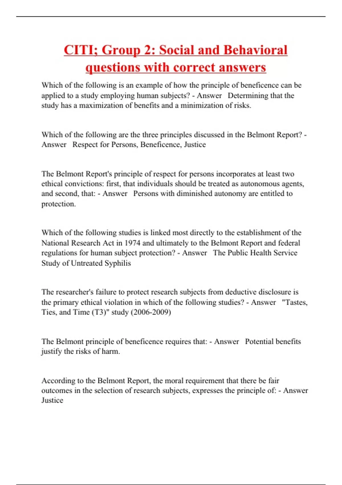 CITI; Group 2: Social and Behavioral questions with correct answers