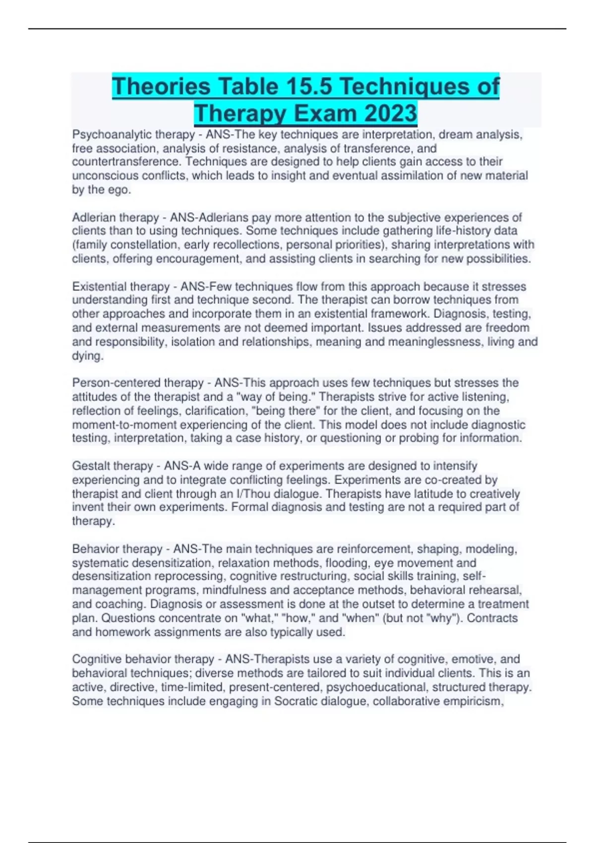 Theories Table 15.5 Techniques of Therapy Exam 2023 Psychoanalytic therapy - ANS-The key techniques are interpretation, dream analysis, free association, analysis of resistance, analysis of transference, and countertransference. Techniques are designed to help clients gain access to their unconscious conflicts, which leads to insight and eventual assimilation of new material by the ego. Adlerian therapy - ANS-Adlerians pay more attention to the subjective experiences of clients than to using techniques. Some techniques include gathering life-history data (family constellation, early recollections, personal priorities), sharing interpretations with clients, offering encouragement, and assisting clients in searching for new possibilities. Existential therapy - ANS-Few techniques flow from this approach because it stresses understanding first and technique second. The therapist can borrow techniques from other approaches and incorporate them in an existential framework. Diagnosis, testing, and external measurements are not deemed important. Issues addressed are freedom and responsibility, isolation and relationships, meaning and meaninglessness, living and dying. Person-centered therapy - ANS-This approach uses few techniques but stresses the attitudes of the therapist and a "way of being." Therapists strive for active listening, reflection of feelings, clarification, "being there" for the client, and focusing on the moment-to-moment experiencing of the client. This model does not include diagnostic testing, interpretation, taking a case history, or questioning or probing for information. Gestalt therapy - ANS-A wide range of experiments are designed to intensify experiencing and to integrate conflicting feelings. Experiments are co-created by therapist and client through an I/Thou dialogue. Therapists have latitude to creatively invent their own experiments. Formal diagnosis and testing are not a required part of therapy. Behavior therapy - ANS- Continues...