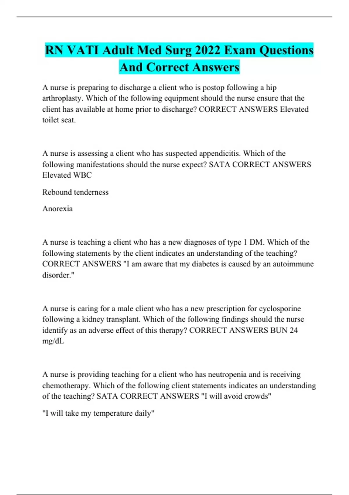 rn vati adult med surg 2022 exam questions and cor
