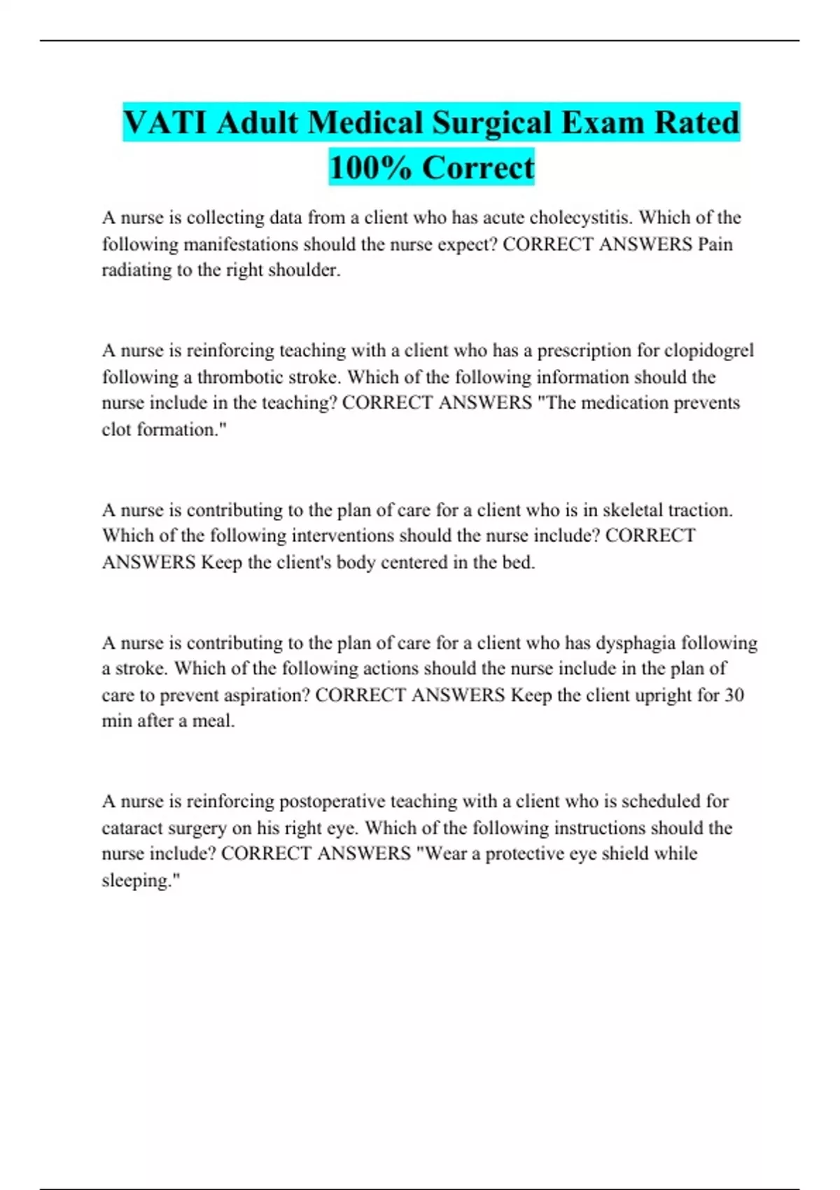 VATI Adult Medical Surgical Exam Rated 100% Correct