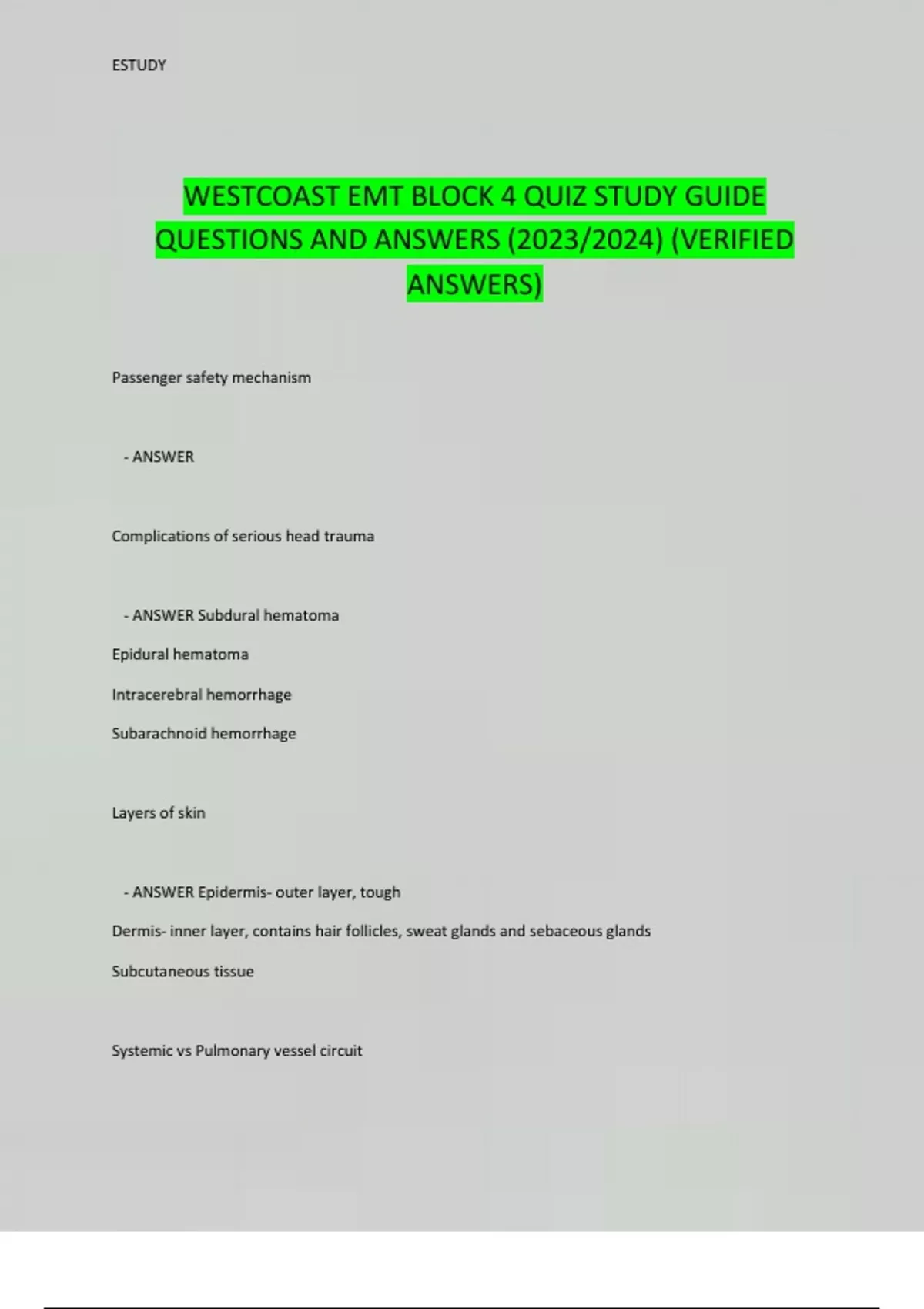 WESTCOAST EMT BLOCK 4 QUIZ STUDY GUIDE QUESTIONS AND ANSWERS (2023/2024) (VERIFIED ANSWERS)