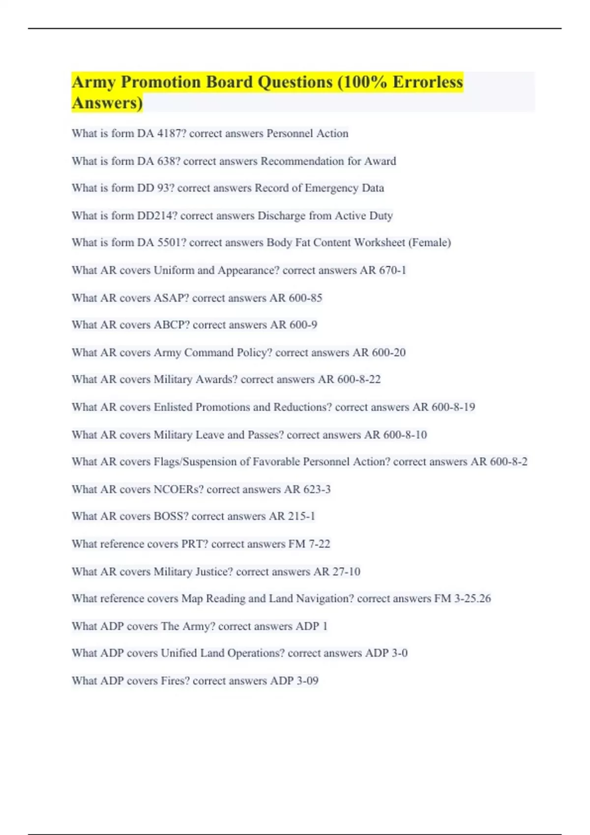 What is form DA 4187? correct answers Personnel Action What is form DA 638? correct answers Recommendation for Award What is form DD 93? correct answers Record of Emergency Data What is form DD214? correct answers Discharge from Active Duty What is form DA 5501? correct answers Body Fat Content Worksheet (Female) What AR covers Uniform and Appearance? correct answers AR 670-1 What AR covers ASAP? correct answers AR 600-85 What AR covers ABCP? correct answers AR 600-9 What AR covers Army Command Policy? correct answers AR 600-20 What AR covers Military Awards? correct answers AR 600-8-22 What AR covers Enlisted Promotions and Reductions? correct answers AR 600-8-19 What AR covers Military Leave and Passes? correct answers AR 600-8-10 What AR covers Flags/Suspension of Favorable Personnel Action? correct answers AR 600-8-2 What AR covers NCOERs? correct answers AR 623-3 What AR covers BOSS? correct answers AR 215-1 What reference covers PRT? correct answers FM 7-22 What AR covers Military Justice? correct answers AR 27-10 What reference covers Map Reading and Land Navigation? correct answers FM 3-25.26 What ADP covers The Army? correct answers ADP 1 What ADP covers Unified Land Operations? correct answers ADP 3-0 What ADP covers Fires? correct answers ADP 3-09
