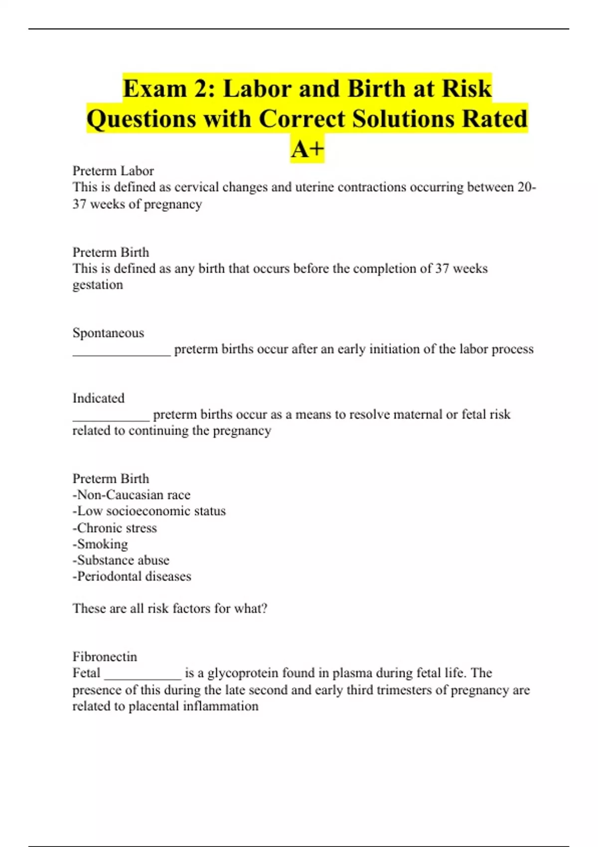 Exam 2: Labor and Birth at Risk Questions with Correct Solutions Rated A+