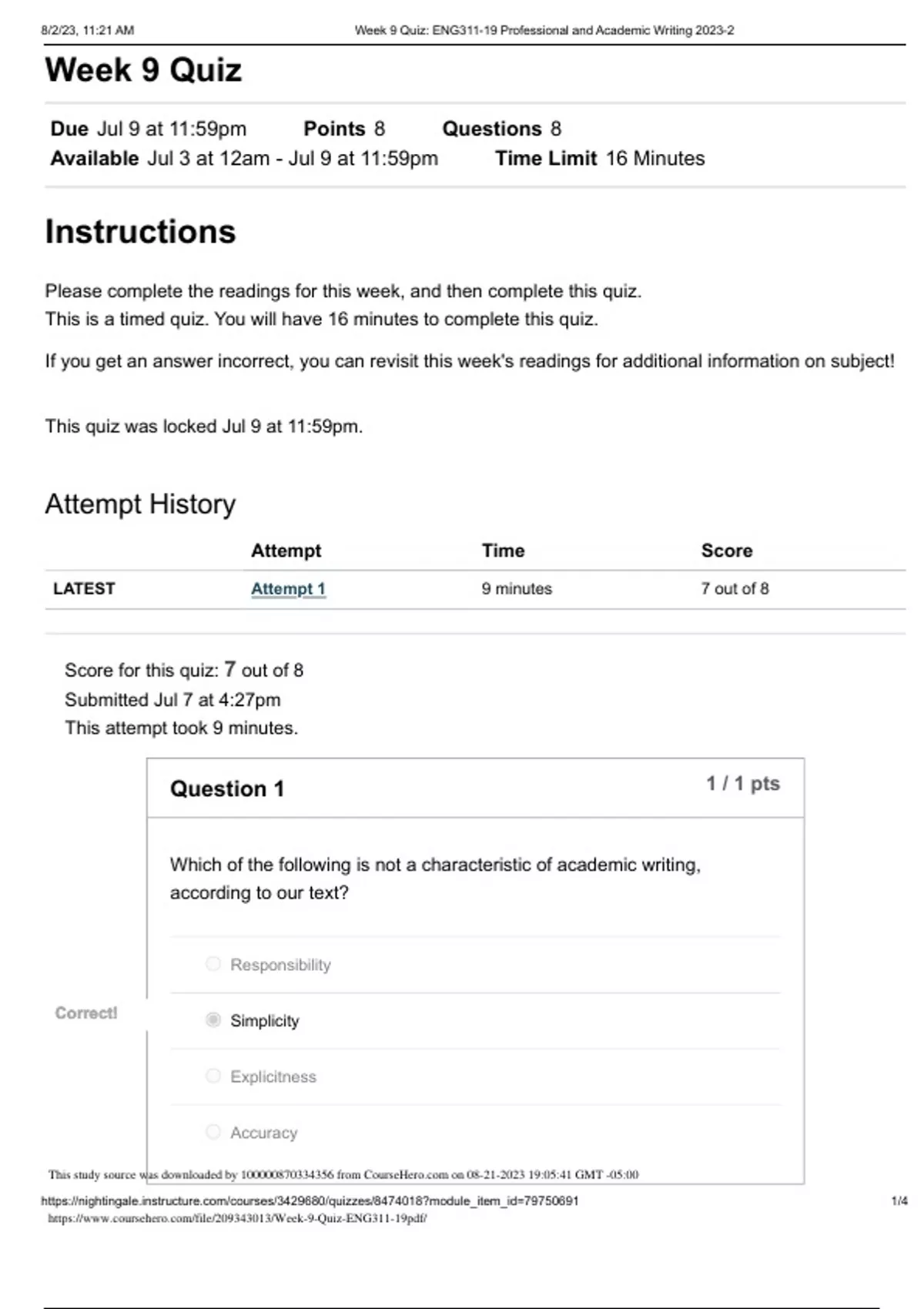Weeks 9-14 Quiz: ENG311-19 Professional and Academic Writing 2023 Quizzes Answered.
