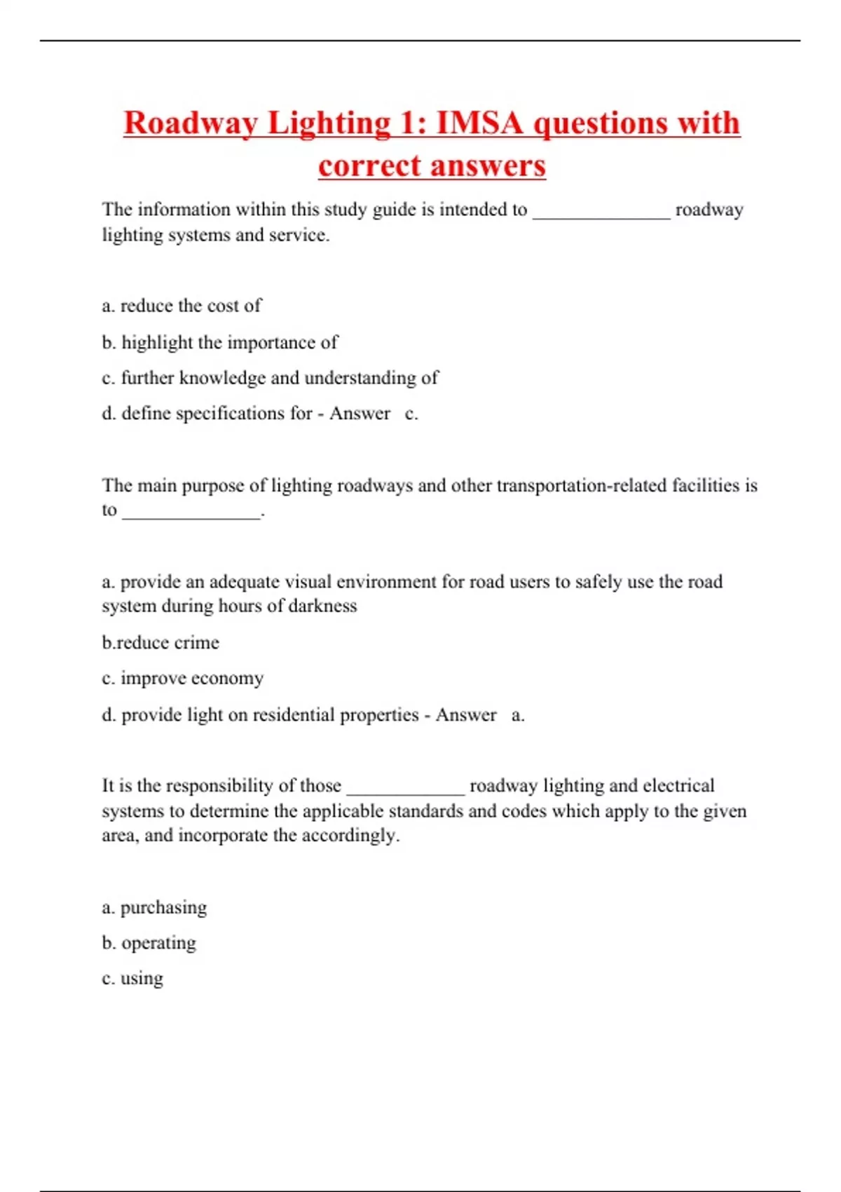 roadway lighting 1 imsa questions with correct an