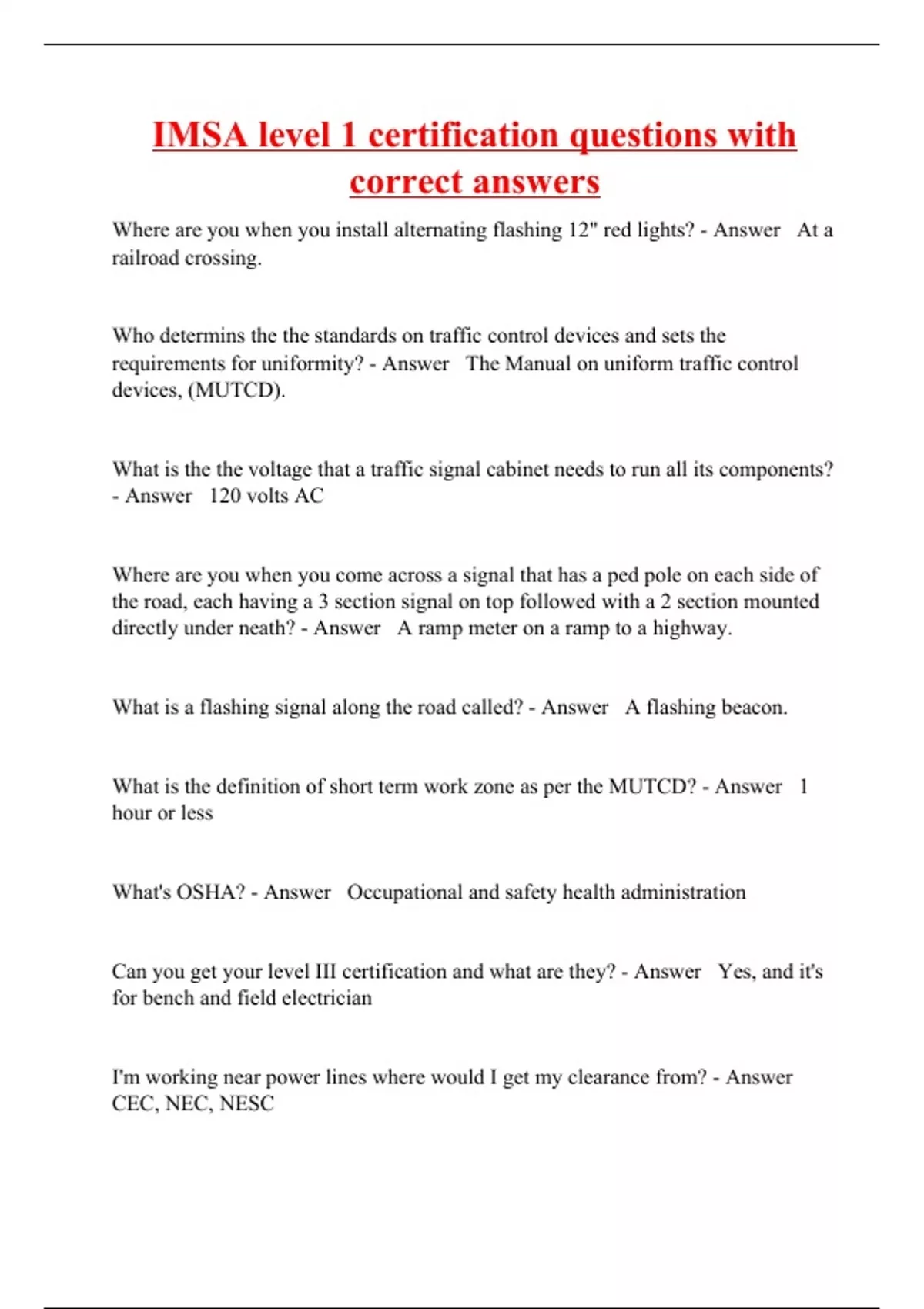 IMSA level 1 certification questions with correct answers