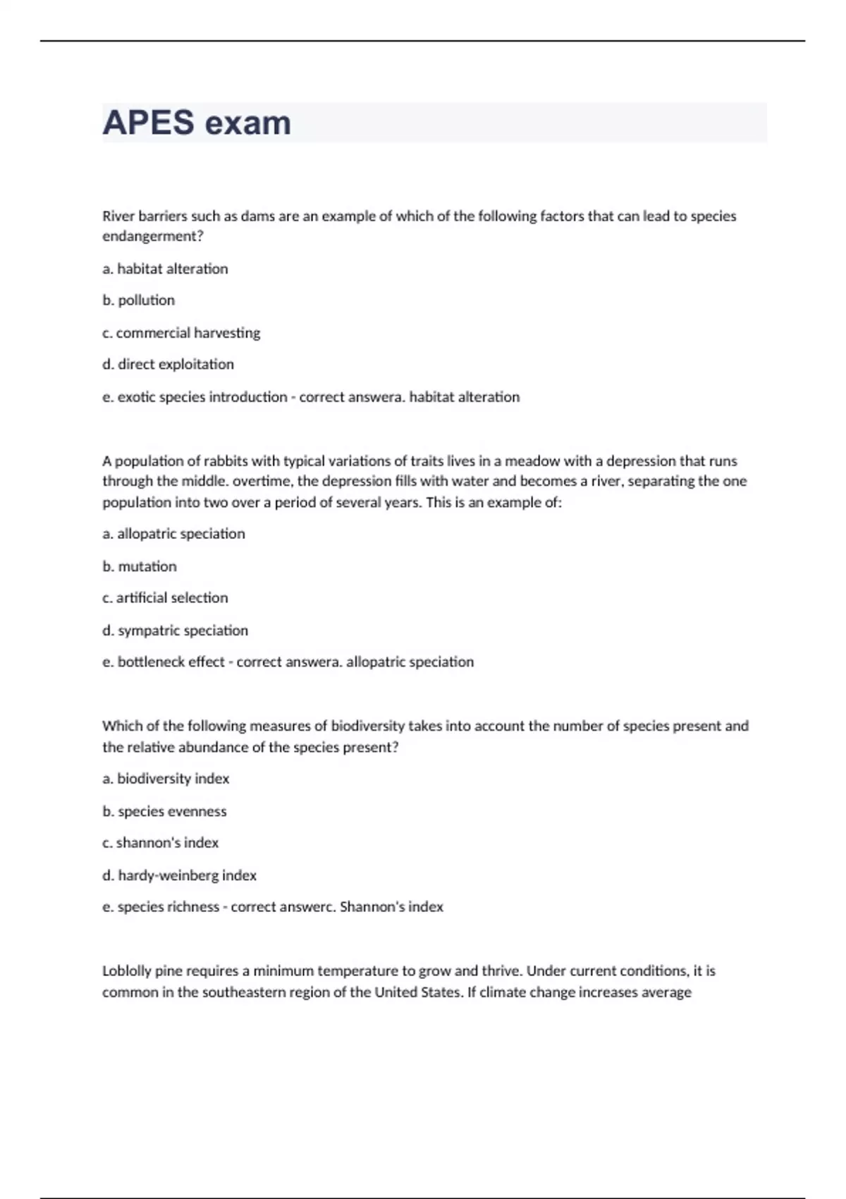 APES exam River barriers such as dams are an example of which of the following factors that can lead to species endangerment? a. habitat alteration b. pollution c. commercial harvesting d. direct exploitation e. exotic species introduction - correct answera. habitat alteration A population of rabbits with typical variations of traits lives in a meadow with a depression that runs through the middle. overtime, the depression fills with water and becomes a river, separating the one population into two over a period of several years. This is an example of: a. allopatric speciation b. mutation c. artificial selection d. sympatric speciation e. bottleneck effect - correct answera. allopatric speciation Which of the following measures of biodiversity takes into account the number of species present and the relative abundance of the species present? a. biodiversity index b. species evenness c. shannon's index d. hardy-weinberg index e. species richness - correct answerc. Shannon's index Loblolly pine requires a minimum temperature to grow and thrive. Under current conditions, it is common in the southeastern region of the United States. If climate change increases average temperatures, how would you expect the distribution of the loblolly pine to change? The loblolly pine distribution would... a. spread further to the north b. spread further to the south c. spread further to the west d. spread further to the east e. not change - correct answer What occurs when a small group of a population colonizes a new area? a. artificial selection b. founder effect c. genetic drift d. bottleneck effect e. sympatric speciation - correct answerb. founder effect Which type of species would be most vulnerable to environmental changes? a. species with high genetic variation b. species with a large population size c. niche specialists d. species with rapid reproductive rates e. niche generalists - correct answerc. niche specialists The international legislation that establishes a list of endangered species susceptible to trade and thus forth endangerment is called the... a. Lacey Act b. Marine Mammal Protection Act c. Endangered species act d. National Environmental Protection act e. Convention on the International Trade of Endangered Species - correct answere. Convention on the International Trade of Endangered Species Which of the following statements about mutations is incorrect? a. mutations may be caused by environmental factors such as UV radiations b. All mutations are harmful c. A mutation is a change in an organism's DNA d. Many mutations cause the offspring to die before they are born e. Mutations may lead to greater genetic diversity - correct answerb. all mutations are harmful Which of the following is not considered to be contributing to the current increase in extinction rates? a. introduction of invasive species b. climate change c. natural selection d. habitat destruction e. overharvesting - correct answerc. natural selection When a population suddenly reduces in size either from habitat loss, natural disaster, or other changes in the environment, its genetic variation is affected. When this occurs, this is known as: a. bottleneck effect b. geographic isolation c. genetic drift d. founder effect e. mutation - correct answera. bottleneck effect Which of the following pairs would increase the rate of evolution within a species? a. rapid environmental change and large population size b. slow environmental change and high genetic variation c. short generation time and large population size d. long generation time and low genetic variation e. large population size and slow environmental change - correct answerb. slow environmental change and high genetic variation The facility known as the Svalbard Global seed vault is designed to preserve a. breeding secrets b. emergency food stores c. know seed pests d. seed diversity e. radioactive seeds too dangerous to plant - correct answerd. seed diversity Which of the following is not a key component of the theory of evolution by natural selection? a. differences in traits are not associated with differences in the ability to survive and reproduce b. individuals differ in their traits c. differences in traits can be passed on from parents to offspring d. not all offspring can survive e. individuals produce an excess of offspring - correct answera. differences in traits are not associated with differences in the ability to survive and reproduce A high degree of genetic diversity within a species would be important for all of the following reasons EXCEPT: a. higher overall species diversity b. greater protection against environmental change c. lower potential for inbreeding depression d. higher disease resistance e. increased access to beneficial traits - correct answere. increased access to beneficial traits Which of the following is the best description of evolution? a. the genetic change within a population over one generation b. the increased reproduction of a population c. the growth of an individual from birth to adulthood d. the genetic change in an individual over time e. the genetic change within a population overtime - correct answer When non-local species spread rapidly across large areas, they are called: a. invasive species b. endangered species c. native species d. exotic species e. alien species - correct answera. invasive species The Lacey Act, mandated by the government of the United States, was designed to: a. encourage the harvesting of alien species b. provide a framework of trade of organisms c. inhibit the interstate commerce of illegally harvested species d. raise funds to promote international conservation e. promote the harvesting of species from bordering nations to protect US organisms - correct answerc. inhibit the interstate commerce of illegally harvested species Alien species often pose a threat to native species because: a. the non-native species does not compete with native species b. alien species often have no natural enemies in 