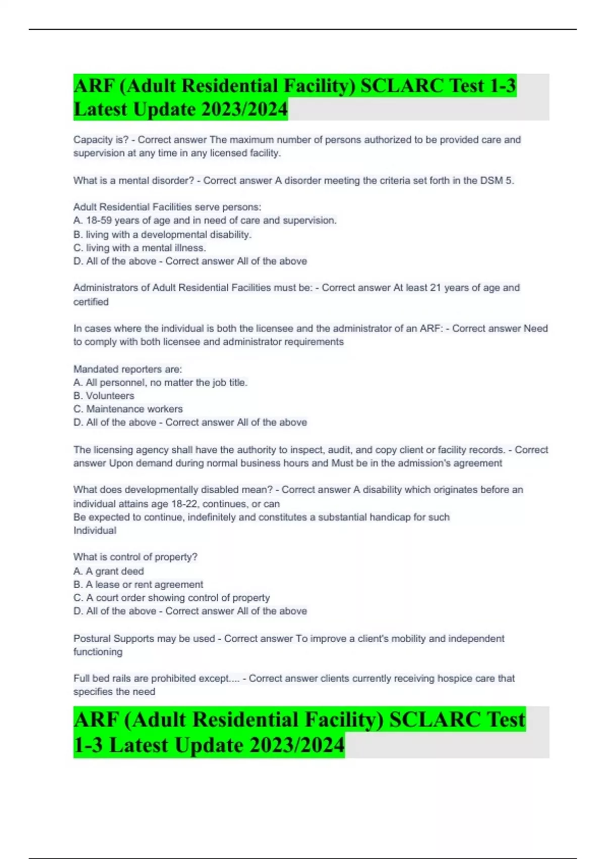ARF (Adult Residential Facility) SCLARC Test 1-3 Latest Update 2023/2024ARF (Adult Residential Facility) SCLARC Test 1-3 Latest Update 2023/2024
