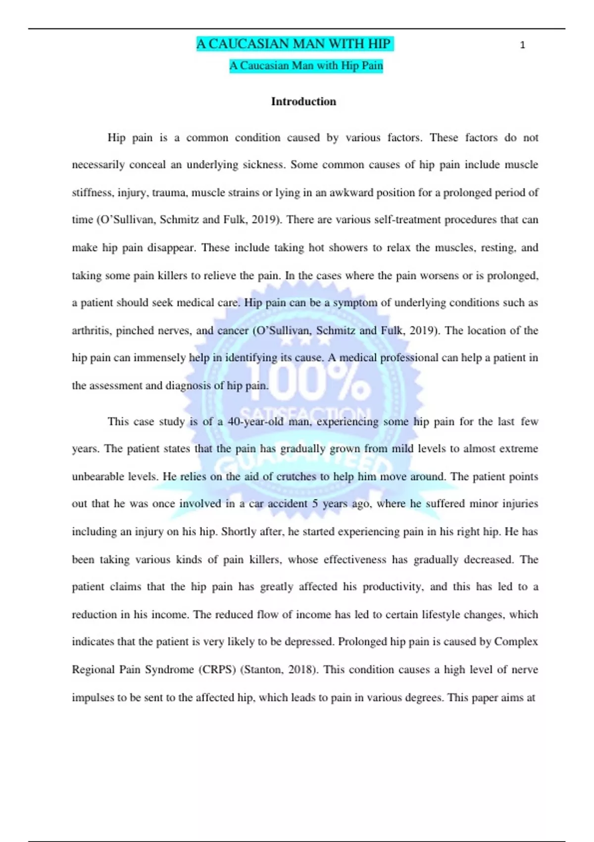 A CAUCASIAN MAN WITH HIP PAIN 1 A Caucasian Man with Hip Pain A Caucasian Man with Hip Pain Introduction Hip pain is a common condition caused by various factors. These factors do not necessarily conceal an underlying sickness. Some common causes of hip pain include muscle stiffness, injury, trauma, muscle strains or lying in an awkward position for a prolonged period of time (O’Sullivan, Schmitz and Fulk, 2019). There are various self-treatment procedures that can make hip pain disappear. These include taking hot showers to relax the muscles, resting, and taking some pain killers to relieve the pain. In the cases where the pain worsens or is prolonged, a patient should seek medical care. Hip pain can be a symptom of underlying conditions such as arthritis, pinched nerves, and cancer (O’Sullivan, Schmitz and Fulk, 2019). The location of the hip pain can immensely help in identifying its cause. A medical professional can help a patient in the assessment and diagnosis of hip pain. This case study is of a 40-year-old man, experiencing some hip pain for the last few years. The patient states that the pain has gradually grown from mild levels to almost extreme unbearable levels. He relies on the aid of crutches to help him move around. The patient points out that he was once involved in a car accident 5 years ago, where he suffered minor injuries including an injury on his hip. Shortly after, he started experiencing pain in his right hip. He has been taking various kinds of pain killers, whose effectiveness has gradually decreased. The patient claims that the hip pain has greatly affected his productivity, and this has led to a reduction in his income. The reduced flow of income has led to certain lifestyle changes, which indicates that the patient is very likely to be depressed. Prolonged hip pain is caused by Complex Regional Pain Syndrome (CRPS) (Stanton, 2018). This condition causes a high level of nerve impulses to be sent to the affected hip, which leads to pain in various degrees. This paper aims at