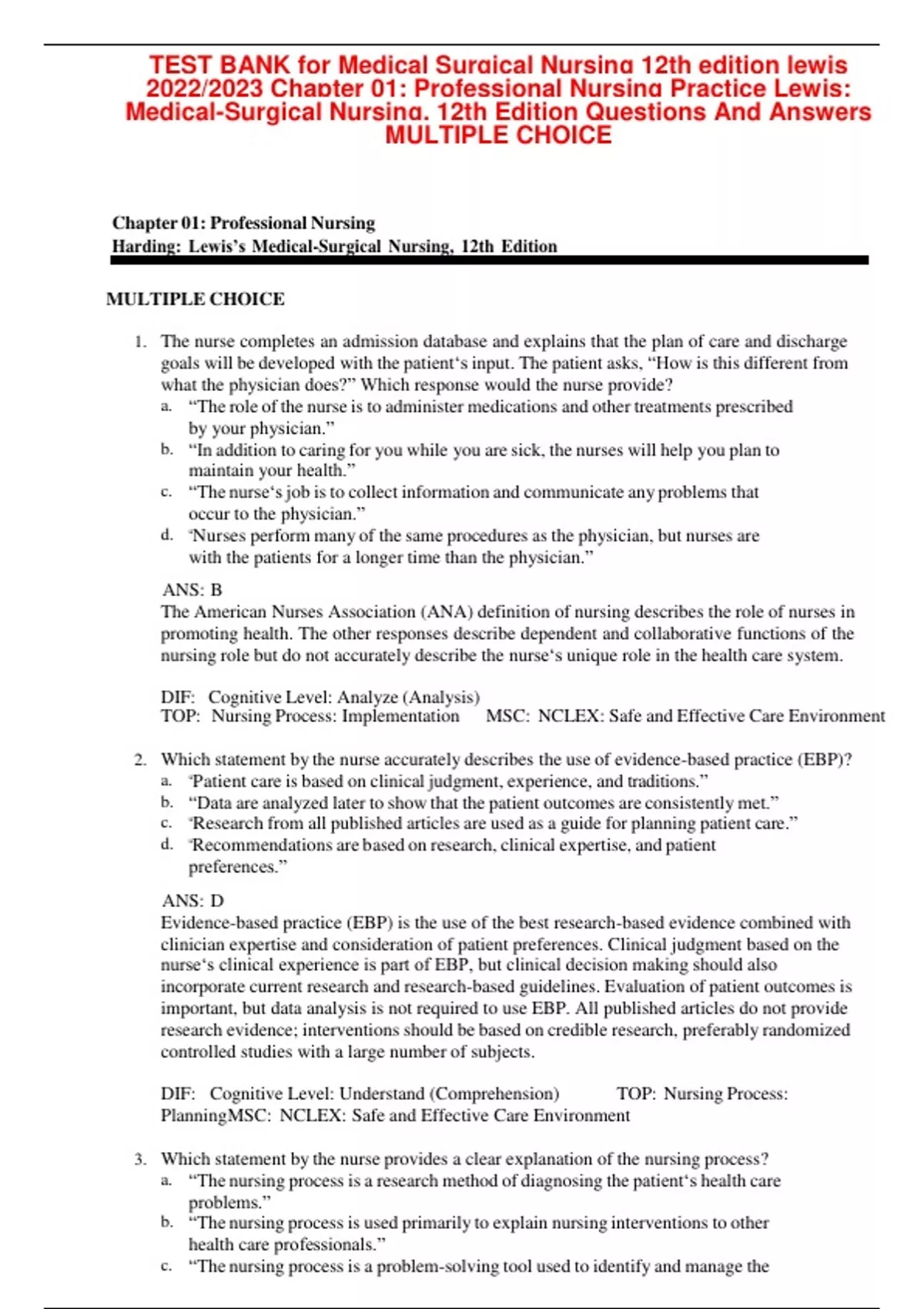 TEST BANK for Medical Surgical Nursing 12th edition lewis 2022/2023 Chapter 01: TEST BANK for Medical Surgical Nursing 12th edition lewis 2022/2023 Chapter 01: Professional Nursing Practice Lewis: Medical-Surgical Nursing, 12th Edition Questions And Answe