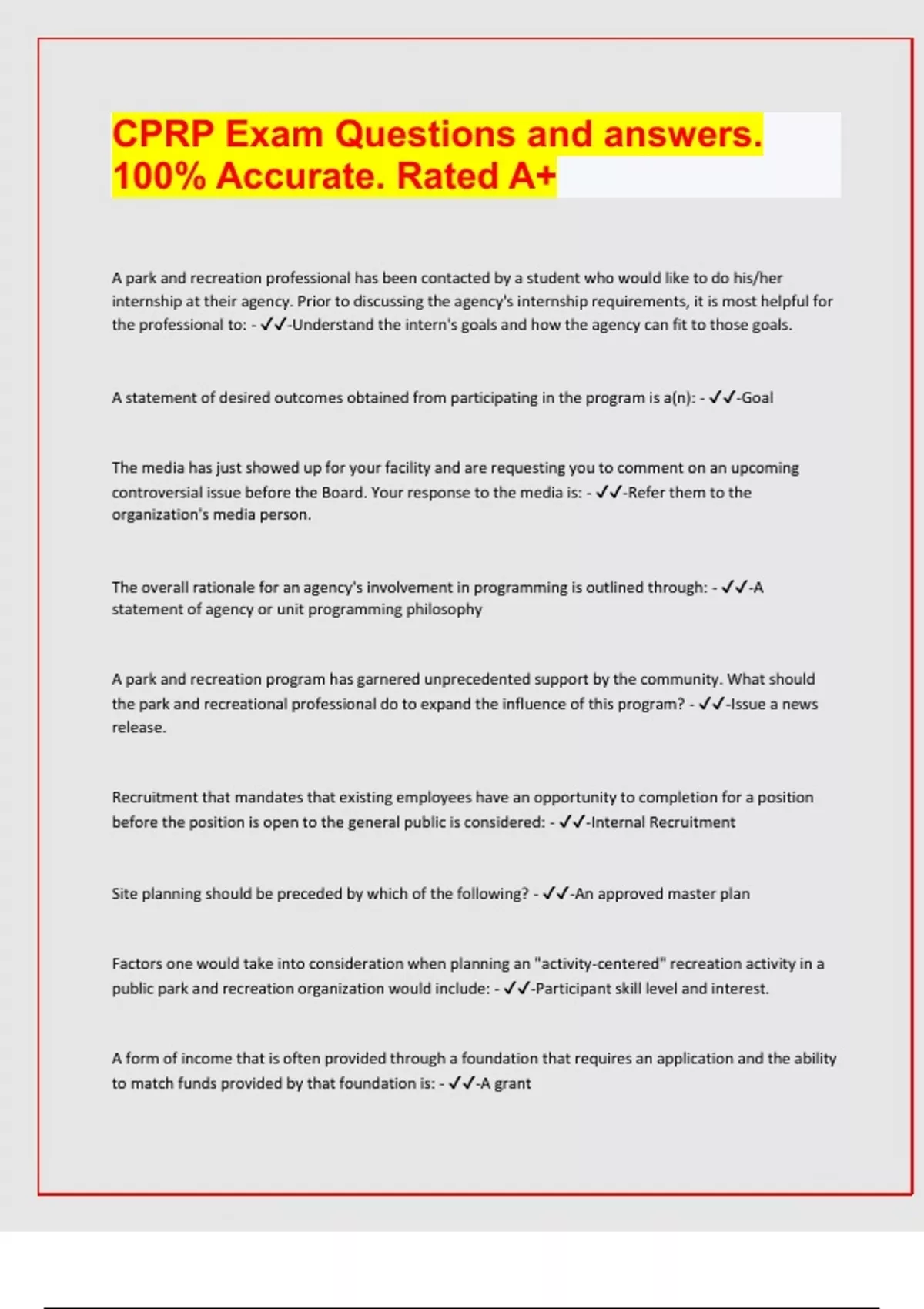 CPRP Exam Questions and answers. 100% Accurate. Rated A+ A park and recreation professional has been contacted by a student who would like to do his/her internship at their agency. Prior to discussing the agency's internship requirements, it is most helpful for the professional to: - -Understand the intern's goals and how the agency can fit to those goals. A statement of desired outcomes obtained from participating in the program is a(n): - -Goal The media has just showed up for your facility and are requesting you to comment on an upcoming controversial issue before the Board. Your response to the media is: - -Refer them to the organization's media person. The overall rationale for an agency's involvement in programming is outlined through: - -A statement of agency or unit programming philosophy A park and recreation program has garnered unprecedented support by the community. What should the park and recreational professional do to expand the influence of this program? - -Issue a news release. Recruitment that mandates that existing employees have an opportunity to completion for a position before the position is open to the general public is considered: - -Internal Recruitment Site planning should be preceded by which of the following? - -An approved master plan Factors one would take into consideration when planning an "activity-centered" recreation activity in a public park and recreation organization would include: - -Participant skill level and interest. A form of income that is often provided through a foundation that requires an application and the ability to match funds provided by that foundation is: - -A grant Preparing a written report summarizing for your supervisor regarding the summer recreation program is what type of internal communication? - -Formal Records should be kept in which filing format? - -Any that best meets the needs of the agency and its programs Any organizational unit that is administered by a staff person that develops and maintains a budget is: - -A cost-control center The maintenance foreman in charge of plumbing regularly purchases plumbing supplies at the local hardware store. These purchases are made at least three days per week. What is the best way to purchase items in this situation. - -Blanket purchase order Knowing that a volunteer working