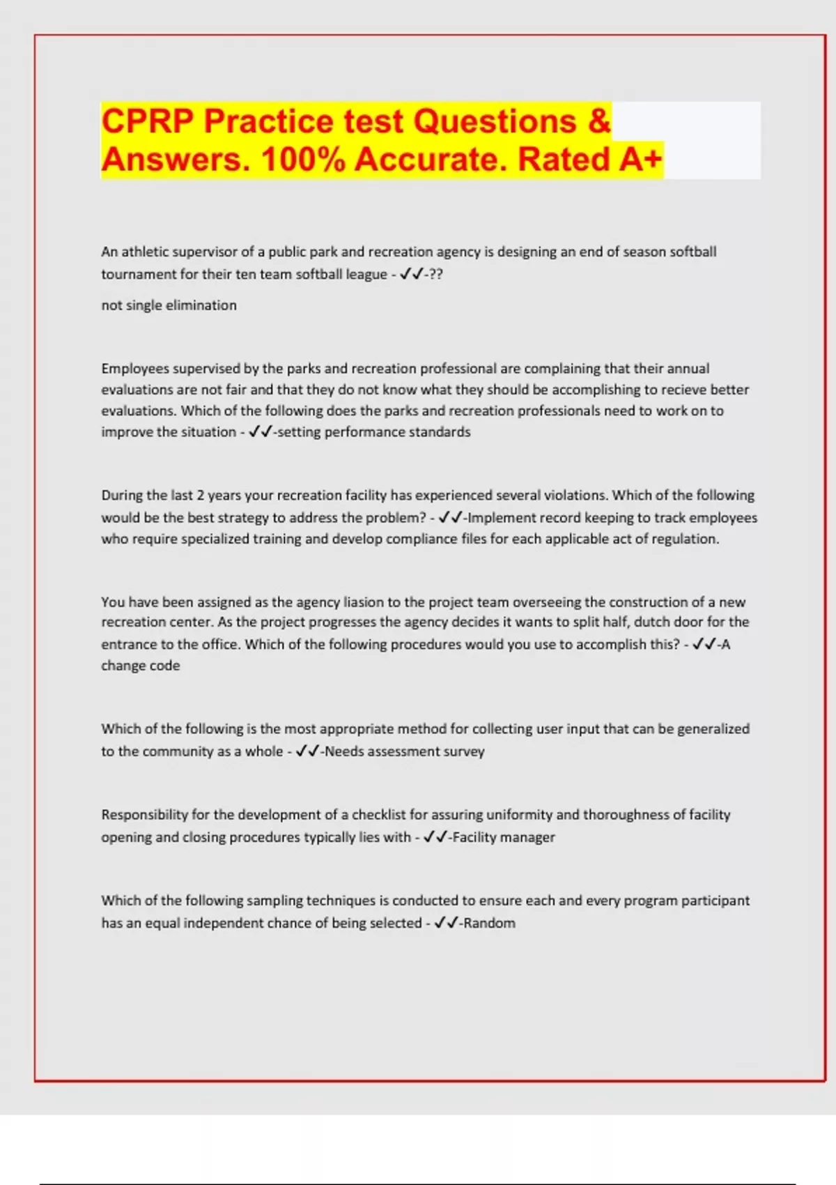 CPRP Practice test Questions & Answers. 100% Accurate. Rated A+ An athletic supervisor of a public park and recreation agency is designing an end of season softball tournament for their ten team softball league - -?? not single elimination Employees supervised by the parks and recreation professional are complaining that their annual evaluations are not fair and that they do not know what they should be accomplishing to recieve better evaluations. Which of the following does the parks and recreation professionals need to work on to improve the situation - -setting performance standards During the last 2 years your recreation facility has experienced several violations. Which of the following would be the best strategy to address the problem? - -Implement record keeping to track employees who require specialized training and develop compliance files for each applicable act of regulation. You have been assigned as the agency liasion to the project team overseeing the construction of a new recreation center. As the project progresses the agency decides it wants to split half, dutch door for the entrance to the office. Which of the following procedures would you use to accomplish this? - -A change code Which of the following is the most appropriate method for collecting user input that can be generalized to the community as a whole - -Needs assessment survey Responsibility for the development of a checklist for assuring uniformity and thoroughness of facility opening and closing procedures typically lies with - -Facility manager Which of the following sampling techniques is conducted to ensure each and every program participant has an equal independent chance of being selected - -Random