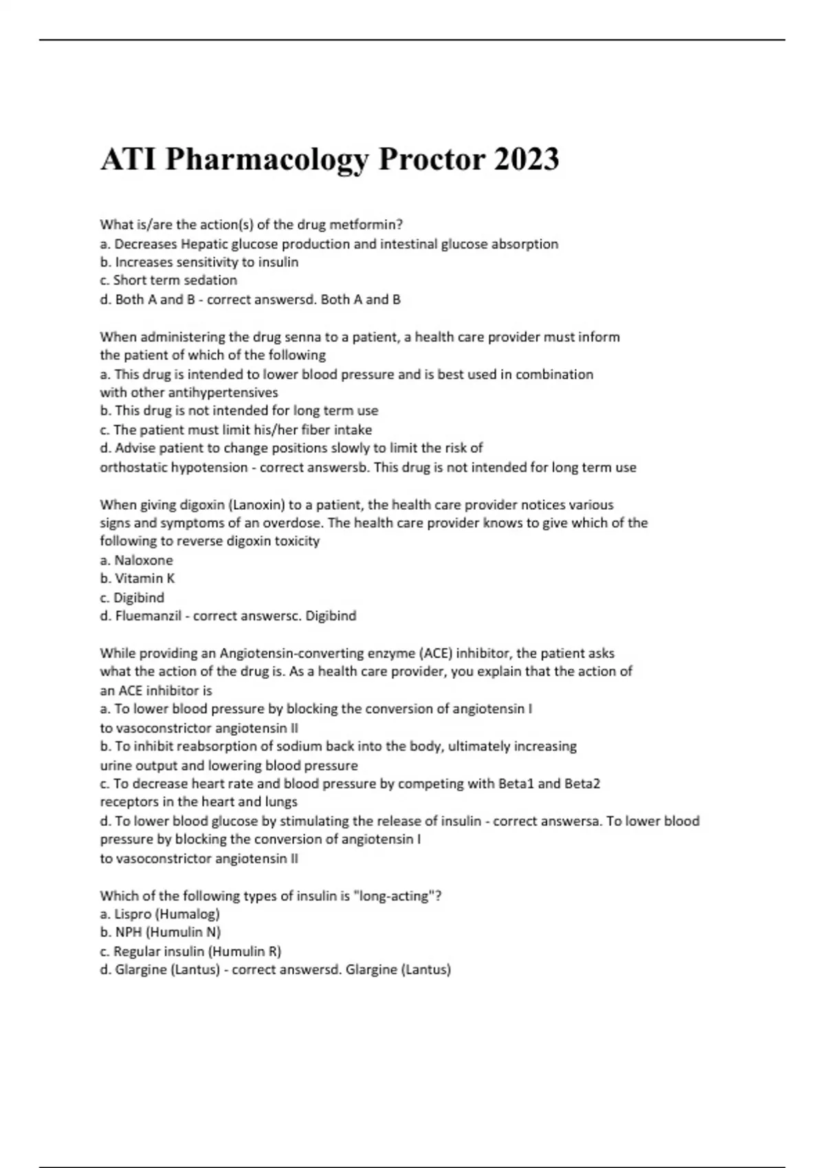 What is/are the action(s) of the drug metformin? a. Decreases Hepatic glucose production and intestinal glucose absorption b. Increases sensitivity to insulin c. Short term sedation d. Both A and B - correct answersd. Both A and B When administering the drug senna to a patient, a health care provider must inform the patient of which of the following a. This drug is intended to lower blood pressure and is best used in combination with other antihypertensives b. This drug is not intended for long term use c. The patient must limit his/her fiber intake d. Advise patient to change positions slowly to limit the risk of orthostatic hypotension - correct answersb. This drug is not intended for long term use When giving digoxin (Lanoxin) to a patient, the health care provider notices various signs and symptoms of an overdose. The health care provider knows to give which of the following to reverse digoxin toxicity a. Naloxone b. Vitamin K c. Digibind d. Fluemanzil - correct answersc. Digibind While providing an Angiotensin-converting enzyme (ACE) inhibitor, the patient asks what the action of the drug is. As a health care provider, you explain that the action of an ACE inhibitor is a. To lower blood pressure by blocking the conversion of angiotensin I to vasoconstrictor angiotensin II b. To inhibit reabsorption of sodium back into the body, ultimately increasing urine output and lowering blood pressure c. To decrease heart rate and blood pressure by competing with Beta1 and Beta2 receptors in the heart and lungs d. To lower blood glucose by stimulating the release of insulin - correct answersa. To lower blood pressure by blocking the conversion of angiotensin I to vasoconstrictor angiotensin II Which of the following types of insulin is "long-acting"? a. Lispro (Humalog) b. NPH (Humulin N) c. Regular insulin (Humulin R) d. Glargine (Lantus) - correct answersd. Glargine (Lantus)