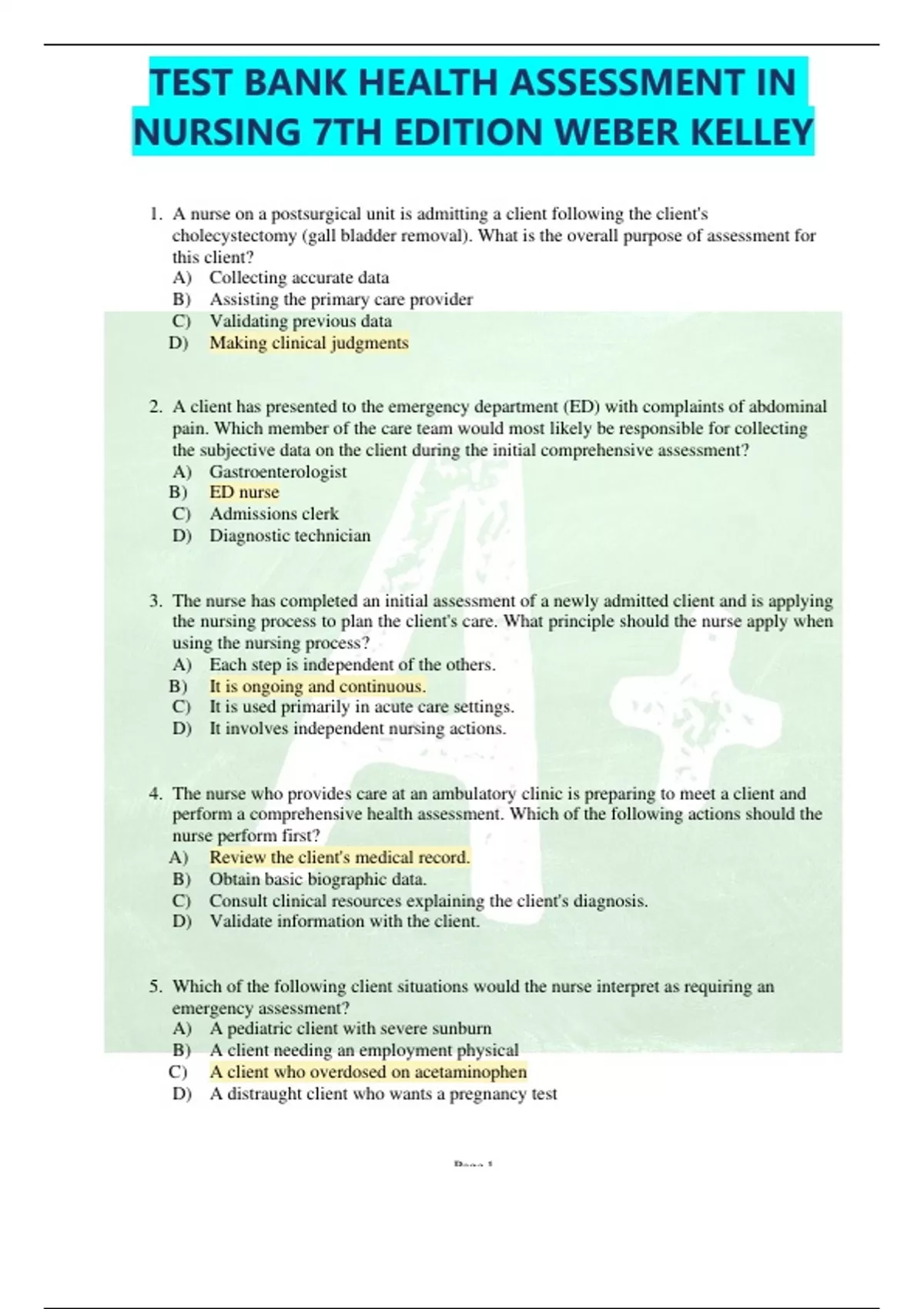 TEST BANK HEALTH ASSESSMENT IN NURSING 7TH EDITION WEBER KELLEY 1. A nurse on a postsurgical unit is admitting a client following the client's cholecystectomy (gall bladder removal). What is the overall purpose of assessment for this client? A) Collecting accurate data B) Assisting the primary care provider C) Validating previous data D) Making clinical judgments 2. A client has presented to the emergency department (ED) with complaints of abdominal pain. Which member of the care team would most likely be responsible for collecting the subjective data on the client during the initial comprehensive assessment? A) Gastroenterologist B) ED nurse C) Admissions clerk D) Diagnostic technician 3. The nurse has completed an initial assessment of a newly admitted client and is applying the nursing process to plan the client's care. What principle should the nurse apply when using the nursing process? A) Each step is independent of the others. B) It is ongoing and continuous. C) It is used primarily in acute care settings. D) It involves independent nursing actions. 4. The nurse who provides care at an ambulatory clinic is preparing to meet a client and perform a comprehensive health assessment. Which of the following actions should the nurse perform first? A) Review the client's medical record. B) Obtain basic biographic data. C) Consult clinical resources explaining the client's diagnosis. D) Validate information with the client. 5. Which of the following client situations would the nurse interpret as requiring an emergency assessment? A) A pediatric client with severe sunburn B) A client needing an employment physical C) A client who overdosed on acetaminophen D) A distraught client who wants a pregnancy test