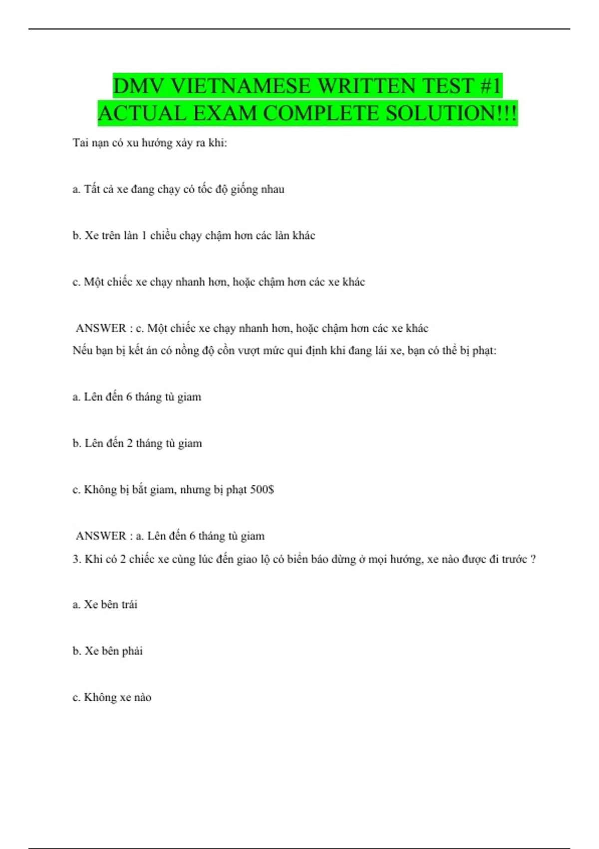 DMV VIETNAMESE WRITTEN TEST #1 ACTUAL EXAM COMPLETE SOLUTION!!!