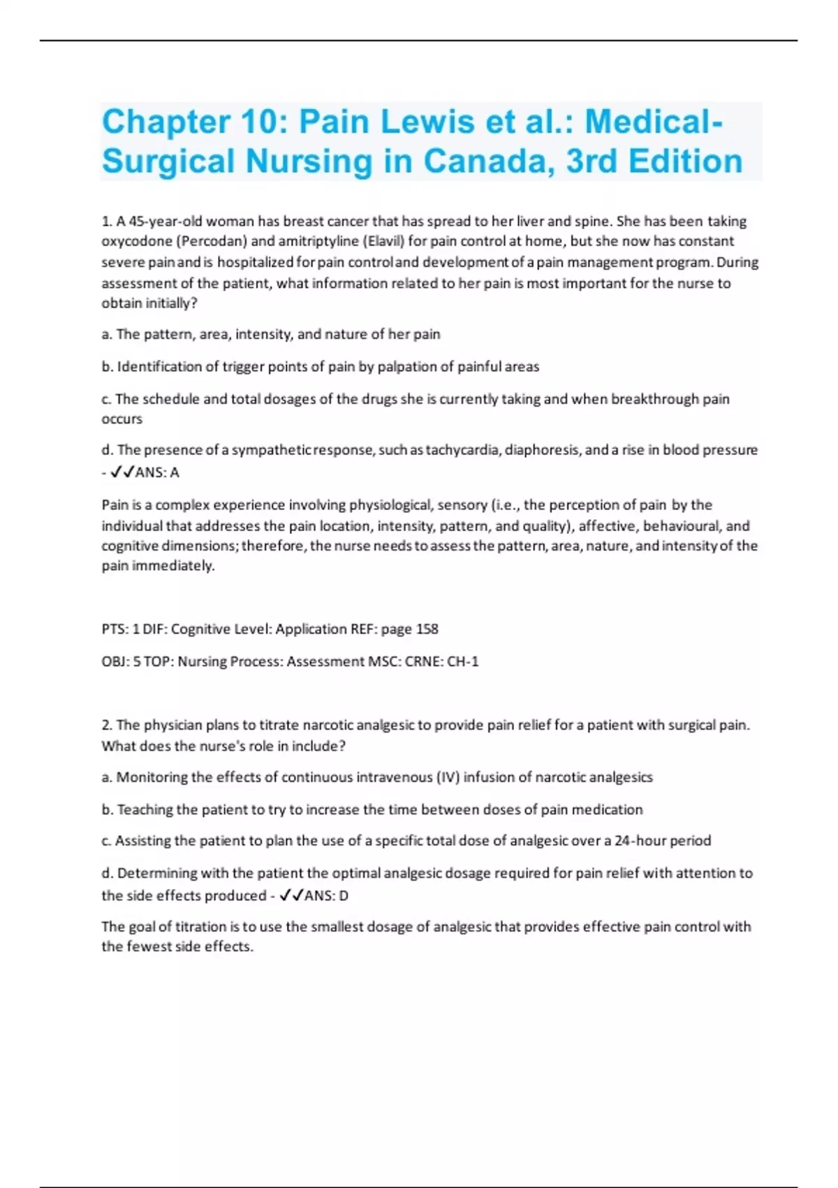 1. A 45-year-old woman has breast cancer that has spread to her liver and spine. She has been taking oxycodone (Percodan) and amitriptyline (Elavil) for pain control at home, but she now has constant severe pain and is hospitalized for pain control and development of a pain management program. During assessment of the patient, what information related to her pain is most important for the nurse to obtain initially? a. The pattern, area, intensity, and nature of her pain b. Identification of trigger points of pain by palpation of painful areas c. The schedule and total dosages of the drugs she is currently taking and when breakthrough pain occurs d. The presence of a sympathetic response, such as tachycardia, diaphoresis, and a rise in blood pressure - ANS: A Pain is a complex experience involving physiological, sensory (i.e., the perception of pain by the individual that addresses the pain location, intensity, pattern, and quality), affective, behavioural, and cognitive dimensions; therefore, the nurse needs to assess the pattern, area, nature, and intensity of the pain immediately. PTS: 1 DIF: Cognitive Level: Application REF: page 158 OBJ: 5 TOP: Nursing Process: Assessment MSC: CRNE: CH-1 2. The physician plans to titrate narcotic analgesic to provide pain relief for a patient with surgical pain. What does the nurse's role in include? a. Monitoring the effects of continuous intravenous (IV) infusion of narcotic analgesics b. Teaching the patient to try to increase the time between doses of pain medication c. Assisting the patient to plan the use of a specific total dose of analgesic over a 24-hour period d. Determining with the patient the optimal analgesic dosage required for pain relief with attention to the side effects produced - ANS: D The goal of titration is to use the smallest dosage of analgesic that provides effective pain control with the fewest side effects.PTS: 1 DIF: Cognitive Level: Application REF: page 166 OBJ: 6 TOP: Nursing Process: Implementation MSC: CRNE: CH-52 3. It is determined that a step 3 drug as proposed by the World Health Organization (WHO) is necessary for a patient whose cancer pain is unrelieved by step 2 drugs. Which is an appropriate drug and route for this patient? a. Oral codeine b. Oral morphine c. Intramuscular meperidine (Demerol) d. Intravenous oxymorphone (Numorphan) - ANS: B