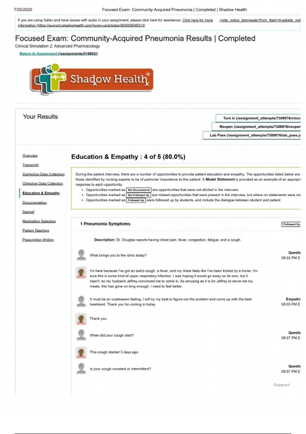 Focused Exam: Community-Acquired Pneumonia Shadow Health- Education and Empathy