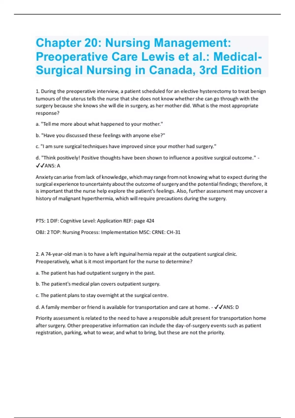 1. During the preoperative interview, a patient scheduled for an elective hysterectomy to treat benign tumours of the uterus tells the nurse that she does not know whether she can go through with the surgery because she knows she will die in surgery, as her mother did. What is the most appropriate response? a. "Tell me more about what happened to your mother." b. "Have you discussed these feelings with anyone else?" c. "I am sure surgical techniques have improved since your mother had surgery." d. "Think positively! Positive thoughts have been shown to influence a positive surgical outcome." - ANS: A Anxiety can arise from lack of knowledge, which may range from not knowing what to expect during the surgical experience to uncertainty about the outcome of surgery and the potential findings; therefore, it is important that the nurse help explore the patient's feelings. Also, further assessment may uncover a history of malignant hyperthermia, which will require precautions during the surgery. PTS: 1 DIF: Cognitive Level: Application REF: page 424 OBJ: 2 TOP: Nursing Process: Implementation MSC: CRNE: CH-31 2. A 74-year-old man is to have a left inguinal hernia repair at the outpatient surgical clinic. Preoperatively, what is it most important for the nurse to determine? a. The patient has had outpatient surgery in the past. b. The patient's medical plan covers outpatient surgery. c. The patient plans to stay overnight at the surgical centre. d. A family member or friend is available for transportation and care at home. - ANS: D Priority assessment is related to the need to have a responsible adult present for transportation home after surgery. Other preoperative information can include the day-of-surgery events such as patient registration, parking, what to wear, and what to bring, but these are not the priority.PTS: 1 DIF: Cognitive Level: Application REF: page 429 OBJ: 2 TOP: Nursing Process: Implementation MSC: CRNE: CH-31 3. A 36-year-old woman has been admitted to the hospital for knee surgery. Which of the following information that was obtained by the nurse during the preoperative assessment should be reported to the surgeon before surgery is performed? a. Lack of knowledge about postoperative pain control b. Knowledge of the possibility of an early, unplanned pregnancy c. History of a postoperative infection following a prior cholecystectomy d. Concern that she will be physically limited in caring for her children for a period postoperatively - ANS: B
