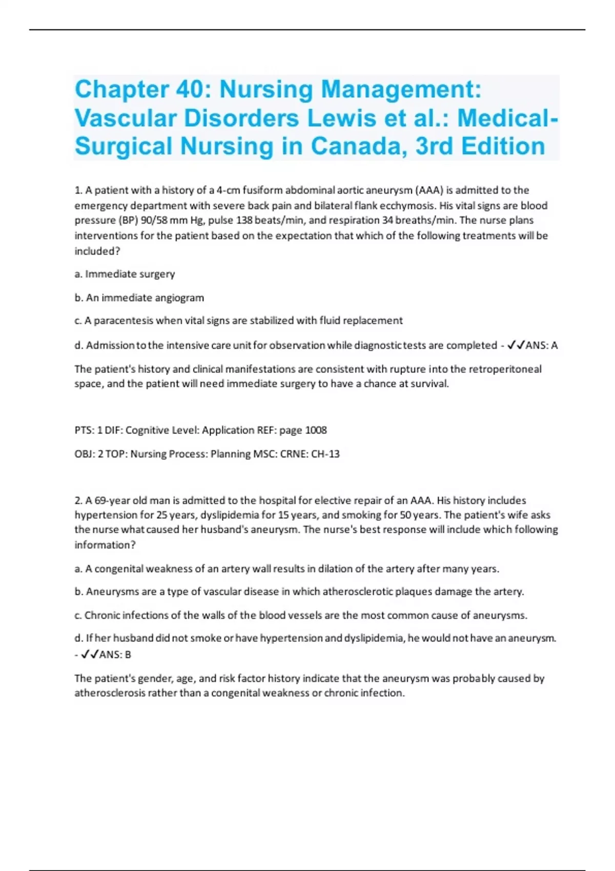 1. A patient with a history of a 4-cm fusiform abdominal aortic aneurysm (AAA) is admitted to the emergency department with severe back pain and bilateral flank ecchymosis. His vital signs are blood pressure (BP) 90/58 mm Hg, pulse 138 beats/min, and respiration 34 breaths/min. The nurse plans interventions for the patient based on the expectation that which of the following treatments will be included? a. Immediate surgery b. An immediate angiogram c. A paracentesis when vital signs are stabilized with fluid replacement d. Admission to the intensive care unit for observation while diagnostic tests are completed - ANS: A The patient's history and clinical manifestations are consistent with rupture into the retroperitoneal space, and the patient will need immediate surgery to have a chance at survival. PTS: 1 DIF: Cognitive Level: Application REF: page 1008 OBJ: 2 TOP: Nursing Process: Planning MSC: CRNE: CH-13 2. A 69-year old man is admitted to the hospital for elective repair of an AAA. His history includes hypertension for 25 years, dyslipidemia for 15 years, and smoking for 50 years. The patient's wife asks the nurse what caused her husband's aneurysm. The nurse's best response will include which following information? a. A congenital weakness of an artery wall results in dilation of the artery after many years. b. Aneurysms are a type of vascular disease in which atherosclerotic plaques damage the artery. c. Chronic infections of the walls of the blood vessels are the most common cause of aneurysms. d. If her husband did not smoke or have hypertension and dyslipidemia, he would not have an aneurysm. - ANS: B The patient's gender, age, and risk factor history indicate that the aneurysm was probably caused by atherosclerosis rather than a congenital weakness or chronic infection.PTS: 1 DIF: Cognitive Level: Comprehension REF: page 1007 OBJ: 2 TOP: Nursing Process: Implementation MSC: CRNE: CH-8 3. A 65-year-old patient has a 5-cm thoracic aortic aneurysm that was discovered during a routine chest X-ray examination. When obtaining a nursing history from the patient, what would the nurse specifically ask the patient about? a. Abdominal pain b. Dysphagia c. Intermittent back pain d. Weakness and palpitations - ANS: B