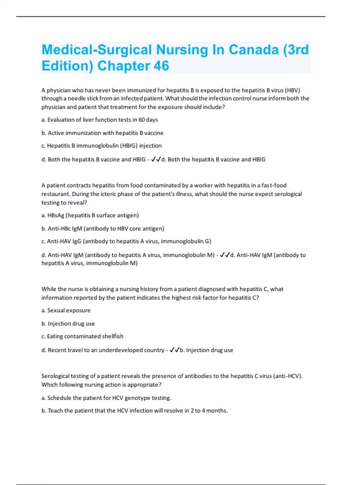 A physician who has never been immunized for hepatitis B is exposed to the hepatitis B virus (HBV) through a needle stick from an infected patient. What should the infection control nurse inform both the physician and patient that treatment for the exposure should include? a. Evaluation of liver function tests in 60 days b. Active immunization with hepatitis B vaccine c. Hepatitis B immunoglobulin (HBIG) injection d. Both the hepatitis B vaccine and HBIG - d. Both the hepatitis B vaccine and HBIG A patient contracts hepatitis from food contaminated by a worker with hepatitis in a fast-food restaurant. During the icteric phase of the patient's illness, what should the nurse expect serological testing to reveal? a. HBsAg (hepatitis B surface antigen) b. Anti-HBc IgM (antibody to HBV core antigen) c. Anti-HAV IgG (antibody to hepatitis A virus, immunoglobulin G) d. Anti-HAV IgM (antibody to hepatitis A virus, immunoglobulin M) - d. Anti-HAV IgM (antibody to hepatitis A virus, immunoglobulin M) While the nurse is obtaining a nursing history from a patient diagnosed with hepatitis C, what information reported by the patient indicates the highest risk factor for hepatitis C? a. Sexual exposure b. Injection drug use c. Eating contaminated shellfish d. Recent travel to an underdeveloped country - b. Injection drug use Serological testing of a patient reveals the presence of antibodies to the hepatitis C virus (anti-HCV). Which following nursing action is appropriate? a. Schedule the patient for HCV genotype testing. b. Teach the patient that the HCV infection will resolve in 2 to 4 months.c. Administer immunoglobulin and the HCV vaccine. d. Instruct the patient on self-administration of -interferon. - a. Schedule the patient for HCV genotype testing
