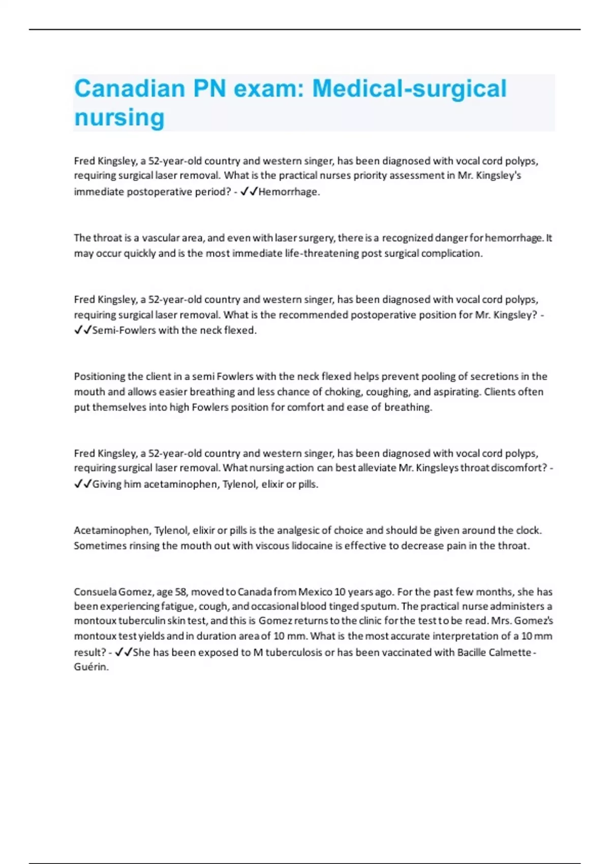 Fred Kingsley, a 52-year-old country and western singer, has been diagnosed with vocal cord polyps, requiring surgical laser removal. What is the practical nurses priority assessment in Mr. Kingsley's immediate postoperative period? - Hemorrhage. The throat is a vascular area, and even with laser surgery, there is a recognized danger for hemorrhage. It may occur quickly and is the most immediate life-threatening post surgical complication. Fred Kingsley, a 52-year-old country and western singer, has been diagnosed with vocal cord polyps, requiring surgical laser removal. What is the recommended postoperative position for Mr. Kingsley? - Semi-Fowlers with the neck flexed. Positioning the client in a semi Fowlers with the neck flexed helps prevent pooling of secretions in the mouth and allows easier breathing and less chance of choking, coughing, and aspirating. Clients often put themselves into high Fowlers position for comfort and ease of breathing. Fred Kingsley, a 52-year-old country and western singer, has been diagnosed with vocal cord polyps, requiring surgical laser removal. What nursing action can best alleviate Mr. Kingsleys throat discomfort? - Giving him acetaminophen, Tylenol, elixir or pills. Acetaminophen, Tylenol, elixir or pills is the analgesic of choice and should be given around the clock. Sometimes rinsing the mouth out with viscous lidocaine is effective to decrease pain in the throat. Consuela Gomez, age 58, moved to Canada from Mexico 10 years ago. For the past few months, she has been experiencing fatigue, cough, and occasional blood tinged sputum. The practical nurse administers a montoux tuberculin skin test, and this is Gomez returns to the clinic for the test to be read. Mrs. Gomez's montoux test yields and in duration area of 10 mm. What is the most accurate interpretation of a 10 mm result? - She has been exposed to M tuberculosis or has been vaccinated with Bacille Calmette - Guérin.This is a positive reaction. It indicates the presence of tuberculosis, TB, Infection but does not show weather the infection is active or dormant. People who have been vaccinated with the bacille Calmette geirin will have positive skin tests due to exposure to the vaccine