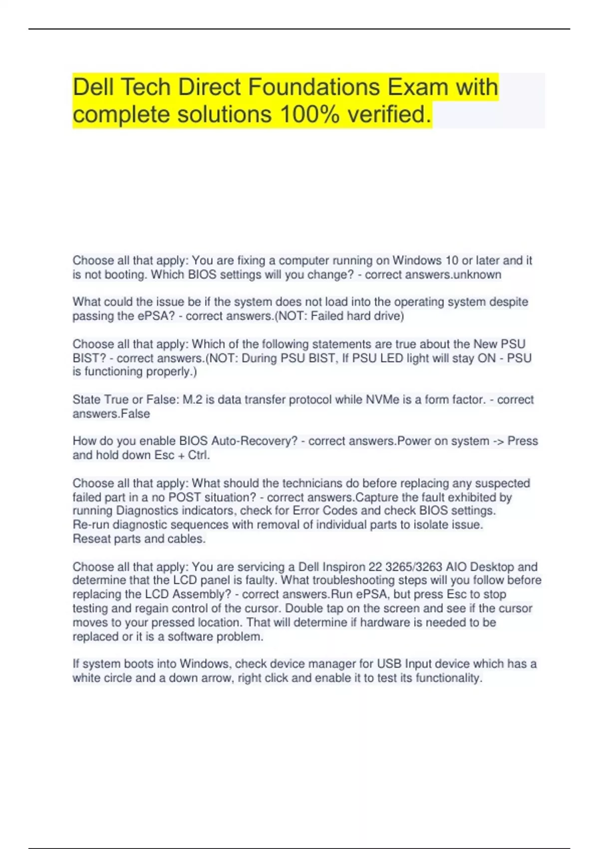 Dell Tech Direct Foundations Exam with complete solutions 100% verified. Choose all that apply: You are fixing a computer running on Windows 10 or later and it is not booting. Which BIOS settings will you change? - correct wn What could the issue be if the system does not load into the operating system despite passing the ePSA? - correct answers.(NOT: Failed hard drive) Choose all that apply: Which of the following statements are true about the New PSU BIST? - correct answers.(NOT: During PSU BIST, If PSU LED light will stay ON - PSU is functioning properly.) State True or False: M.2 is data transfer protocol while NVMe is a form factor. - correct answers.False How do you enable BIOS Auto-Recovery? - correct answers.Power on system -> Press and hold down Esc + Ctrl. Choose all that apply: What should the technicians do before replacing any suspected failed part in a no POST situation? - correct answers.Capture the fault exhibited by running Diagnostics indicators, check for Error Codes and check BIOS settings. Re-run diagnostic sequences with removal of individual parts to isolate issue. Reseat parts and cables. Choose all that apply: You are servicing a Dell Inspiron 22 3265/3263 AIO Desktop and determine that the LCD panel is faulty. What troubleshooting steps will you follow before replacing the LCD Assembly? - correct answers.Run ePSA, but press Esc to stop testing and regain control of the cursor. Double tap on the screen and see if the cursor moves to your pressed location. That will determine if hardware is needed to be replaced or it is a software problem. If system boots into Windows, check device manager for USB Input device which has a white circle and a down arrow, right click and enable it to test its functionality. Choose all that apply: Which of the following items are not affected by the RTC reset? - correct wn Service Tag. Asset Tag. Ownership Tag. Admin Password. System Password. Which is the easiest way to verify the functionality of motherboard during memory failure? - correct wn Choose all that apply: What are the key functions of the BIOS (Basic Input/output System)? - correct answers.Test Activate Identify When should you use RTC Reset? - correct answers.To recover from No POST/No Boot. Choose all that apply: The PC Doctor USB solution offers: - correct answers.DOS Test. Windows Test. Individual Diagnostics. Double Fault - correct answers.a condition in which one or more drives in a RAID array contains data errors, and another drive in the array is no longer an active member of the array due to drive failure, foreign configuration, drive removal, or any other reason. What should a user do to preserve BIOS settings before recovering the system? Answer - correct answers.Set the "Reset NVRAM" option to "Disabled" before starting the recovery process. Choose all that apply: The BIOS Recovery 2 does not support recovery from _________. - correct answers.Hard Disk Drive with password set. Encrypted Hard Drive. Choose all that apply: Select all the steps involved in unpacking parts. - correct answers.All of them How do you initiate RTC reset? - correct answers.Connect System to an AC Power -> Keep the system in a power off state -> Press & hold the Windows key for 25 Seconds -> Release the power button to initiate RTC Reset. Choose all that apply: Which of the following statements are true about Latitude Self-Heal recovery? - correct wn