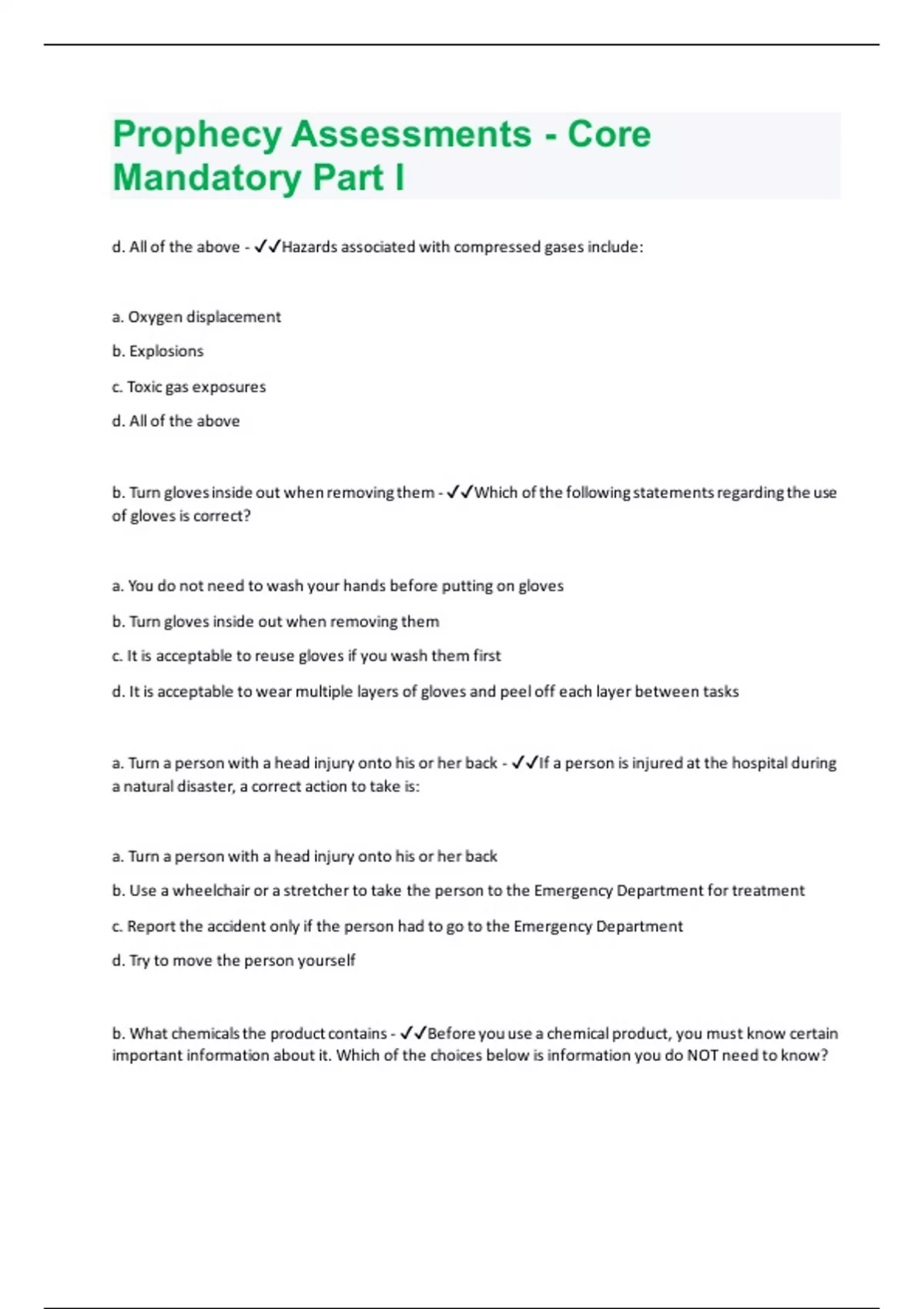 d. All of the above - Hazards associated with compressed gases include: a. Oxygen displacement b. Explosions c. Toxic gas exposures d. All of the above b. Turn gloves inside out when removing them - Which of the following statements regarding the use of gloves is correct? a. You do not need to wash your hands before putting on gloves b. Turn gloves inside out when removing them c. It is acceptable to reuse gloves if you wash them first d. It is acceptable to wear multiple layers of gloves and peel off each layer between tasks a. Turn a person with a head injury onto his or her back - If a person is injured at the hospital during a natural disaster, a correct action to take is: a. Turn a person with a head injury onto his or her back b. Use a wheelchair or a stretcher to take the person to the Emergency Department for treatment c. Report the accident only if the person had to go to the Emergency Department d. Try to move the person yourself b. What chemicals the product contains - Before you use a chemical product, you must know certain important information about it. Which of the choices below is information you do NOT need to know?a. Proper use of the product b. What chemicals the product contains c. Treatment if accidentally exposed to it d. Precautions for safe handling d. All of the above - Healthcare workers who must comply with HIPAA privacy requirements are: a. Doctors, nurses, and others providing direct patient care b. Environmental Services staff c. Engineering staff d. All of the above