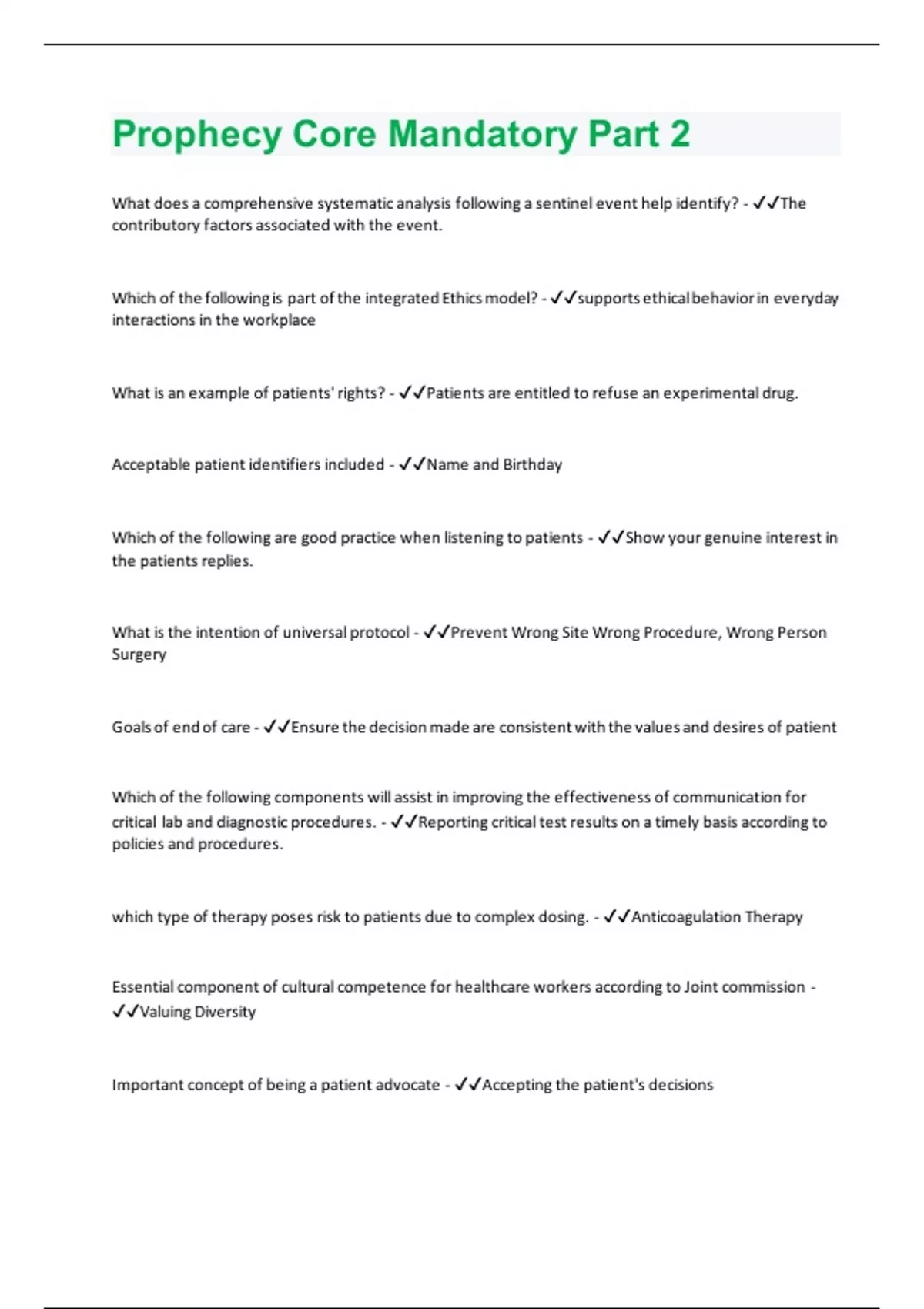 What does a comprehensive systematic analysis following a sentinel event help identify? - The contributory factors associated with the event. Which of the following is part of the integrated Ethics model? - supports ethical behavior in everyday interactions in the workplace What is an example of patients' rights? - Patients are entitled to refuse an experimental drug. Acceptable patient identifiers included - Name and Birthday Which of the following are good practice when listening to patients - Show your genuine interest in the patients replies. What is the intention of universal protocol - Prevent Wrong Site Wrong Procedure, Wrong Person Surgery Goals of end of care - Ensure the decision made are consistent with the values and desires of patient Which of the following components will assist in improving the effectiveness of communication for critical lab and diagnostic procedures. - Reporting critical test results on a timely basis according to policies and procedures. which type of therapy poses risk to patients due to complex dosing. - Anticoagulation Therapy Essential component of cultural competence for healthcare workers according to Joint commission - Valuing Diversity Important concept of being a patient advocate - Accepting the patient's decisions