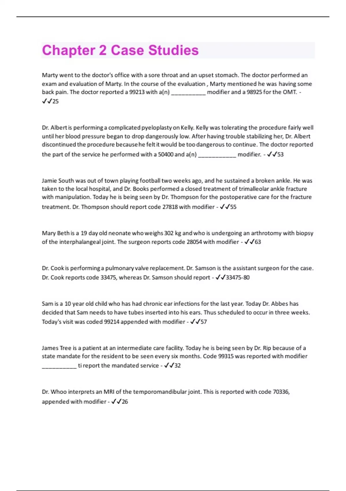 Marty went to the doctor's office with a sore throat and an upset stomach. The doctor performed an exam and evaluation of Marty. In the course of the evaluation , Marty mentioned he was having some back pain. The doctor reported a 99213 with a(n) __________ modifier and a 98925 for the OMT. - 25 Dr. Albert is performing a complicated pyeloplasty on Kelly. Kelly was tolerating the procedure fairly well until her blood pressure began to drop dangerously low. After having trouble stabilizing her, Dr. Albert discontinued the procedure because he felt it would be too dangerous to continue. The doctor reported the part of the service he performed with a 50400 and a(n) ___________ modifier. - 53 Jamie South was out of town playing football two weeks ago, and he sustained a broken ankle. He was taken to the local hospital, and Dr. Books performed a closed treatment of trimalleolar ankle fracture with manipulation. Today he is being seen by Dr. Thompson for the postoperative care for the fracture treatment. Dr. Thompson should report code 27818 with modifier - 55 Mary Beth is a 19 day old neonate who weighs 302 kg and who is undergoing an arthrotomy with biopsy of the interphalangeal joint. The surgeon reports code 28054 with modifier - 63 Dr. Cook is performing a pulmonary valve replacement. Dr. Samson is the assistant surgeon for the case. Dr. Cook reports code 33475, whereas Dr. Samson should report - 33475-80 Sam is a 10 year old child who has had chronic ear infections for the last year. Today Dr. Abbes has decided that Sam needs to have tubes inserted into his ears. Thus scheduled to occur in three weeks. Today's visit was coded 99214 appended with modifier - 57 James Tree is a patient at an intermediate care facility. Today he is being seen by Dr. Rip because of a state mandate for the resident to be seen every six months. Code 99315 was reported with modifier __________ ti report the mandated service - 32 Dr. Whoo interprets an MRI of the temporomandibular joint. This is reported with code 70336, appended with modifier - 26Drs. Jones and Smith work as a surgical team to perform a double lung transplant with cardiopulmonary bypass. Dr. Jones would report code 32854, and Dr. Smith would report code 32854-66. Is this correct? - No, both sould code 32854-66 Dr. Jackson performed a therapeutic pneumothorax on Sally Small and reported code 32960. Later that same day, the procedure was repeated. How should the second procedure be reported? - 32960-76