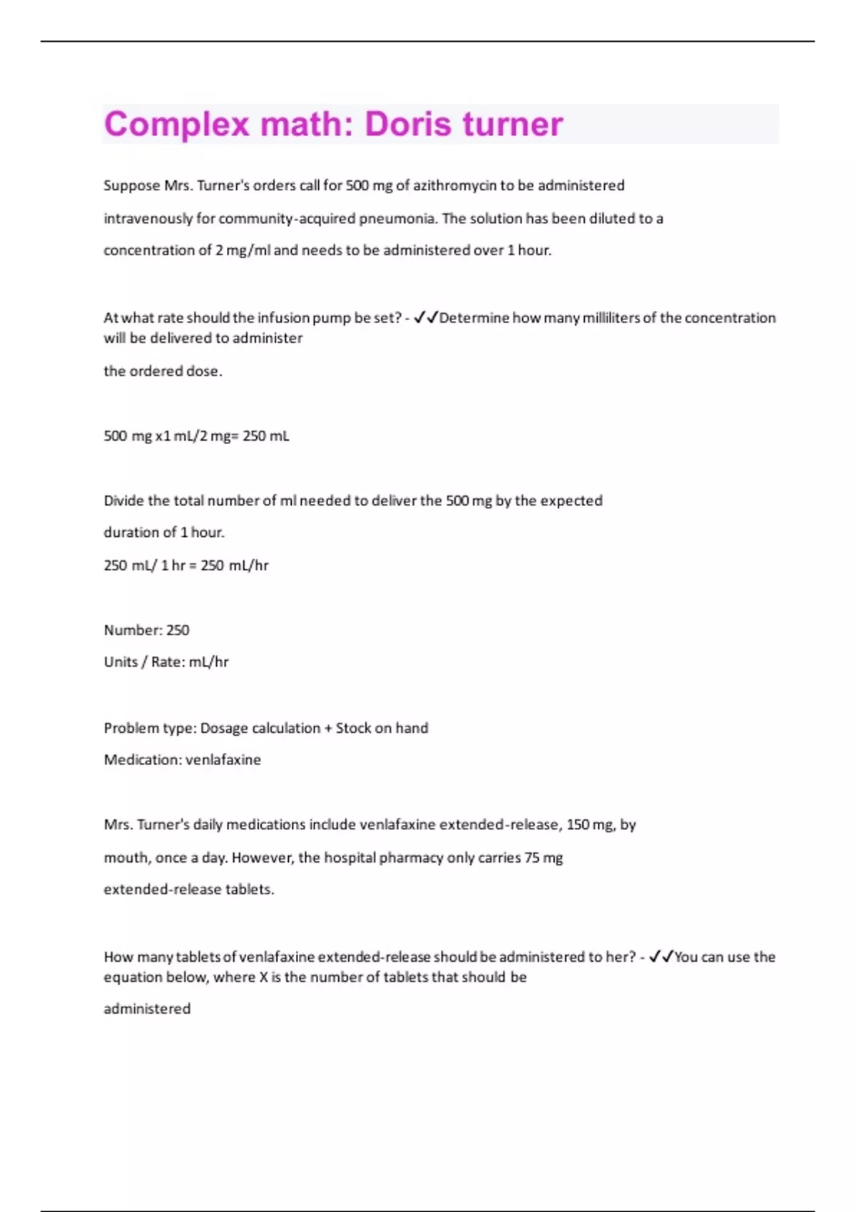 Suppose Mrs. Turner's orders call for 500 mg of azithromycin to be administered intravenously for community-acquired pneumonia. The solution has been diluted to a concentration of 2 mg/ml and needs to be administered over 1 hour. At what rate should the infusion pump be set? - Determine how many milliliters of the concentration will be delivered to administer the ordered dose. 500 mg x1 mL/2 mg= 250 mL Divide the total number of ml needed to deliver the 500 mg by the expected duration of 1 hour. 250 mL/ 1 hr = 250 mL/hr Number: 250 Units / Rate: mL/hr Problem type: Dosage calculation + Stock on hand Medication: venlafaxine Mrs. Turner's daily medications include venlafaxine extended-release, 150 mg, by mouth, once a day. However, the hospital pharmacy only carries 75 mg extended-release tablets. How many tablets of venlafaxine extended-release should be administered to her? - You can use the equation below, where X is the number of tablets that should be administeredD(ordered dose)/H(dose on hand) x Quantity = X SAMPLE SOLUTION 1. Determine what information you have. D (ordered dose) = 150 mg H (dose on hand) = 75 mg Q (quantity) = 1 tablet 2. Plug into the equation and solve D (150 mg) x 1 tablet = X H (75 mg) X = 2 tablets ANSWER Number: 2 Units: tablets Problem tvpe: Total daily dosage Medication: Acetaminophen @ hospital - hypothetical Suppose Mrs. Tumer's provider updated her order for 325 mg, 2 tabs, by mouth q6h PRN temp. > 100.5 F to 325 mg, 2 tabs, by mouth q4h PRN temp. > 100 5 F. The Davis's Drug Guide reports that acetaminophen has a maximum recommended dosage of 4 g/day How many doses can Mrs. Turner take without exceeding the recommended maximum