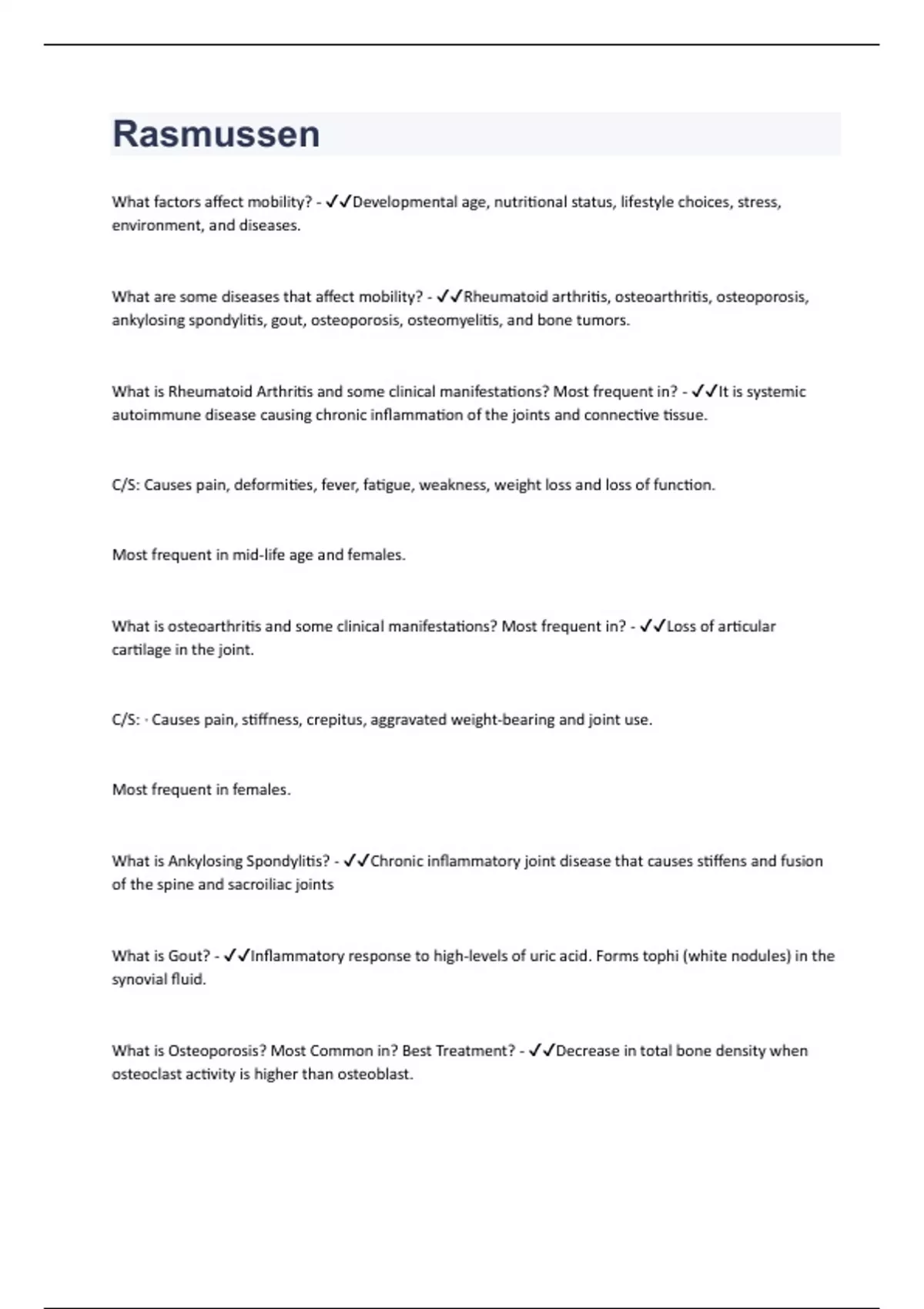 What factors affect mobility? - Developmental age, nutritional status, lifestyle choices, stress, environment, and diseases. What are some diseases that affect mobility? - Rheumatoid arthritis, osteoarthritis, osteoporosis, ankylosing spondylitis, gout, osteoporosis, osteomyelitis, and bone tumors. What is Rheumatoid Arthritis and some clinical manifestations? Most frequent in? - It is systemic autoimmune disease causing chronic inflammation of the joints and connective tissue. C/S: Causes pain, deformities, fever, fatigue, weakness, weight loss and loss of function. Most frequent in mid-life age and females. What is osteoarthritis and some clinical manifestations? Most frequent in? - Loss of articular cartilage in the joint. C/S: · Causes pain, stiffness, crepitus, aggravated weight-bearing and joint use. Most frequent in females. What is Ankylosing Spondylitis? - Chronic inflammatory joint disease that causes stiffens and fusion of the spine and sacroiliac joints What is Gout? - Inflammatory response to high-levels of uric acid. Forms tophi (white nodules) in the synovial fluid. What is Osteoporosis? Most Common in? Best Treatment? - Decrease in total bone density when osteoclast activity is higher than osteoblast.