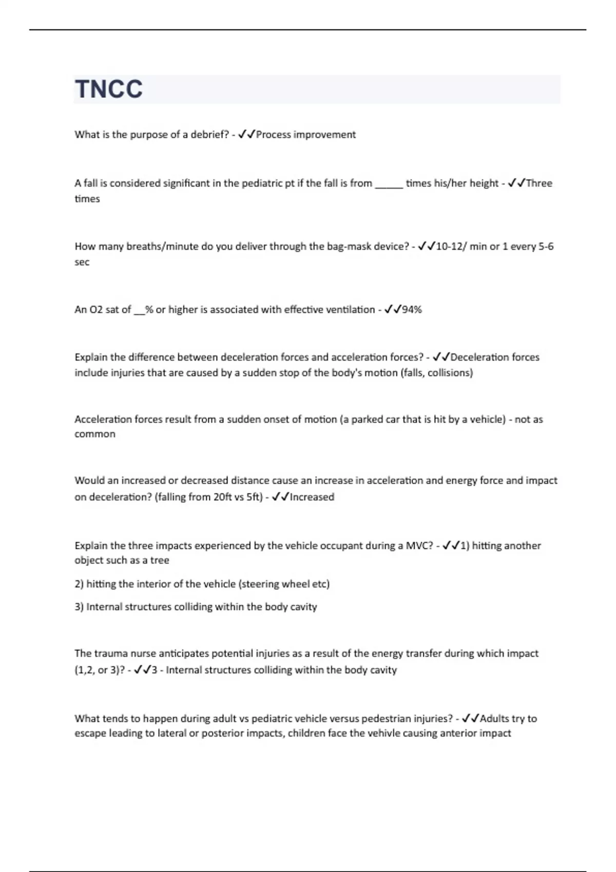 What is the purpose of a debrief? - Process improvement A fall is considered significant in the pediatric pt if the fall is from _____ times his/her height - Three times How many breaths/minute do you deliver through the bag-mask device? - 10-12/ min or 1 every 5-6 sec An O2 sat of __% or higher is associated with effective ventilation - 94% Explain the difference between deceleration forces and acceleration forces? - Deceleration forces include injuries that are caused by a sudden stop of the body's motion (falls, collisions) Acceleration forces result from a sudden onset of motion (a parked car that is hit by a vehicle) - not as common Would an increased or decreased distance cause an increase in acceleration and energy force and impact on deceleration? (falling from 20ft vs 5ft) - Increased Explain the three impacts experienced by the vehicle occupant during a MVC? - 1) hitting another object such as a tree 2) hitting the interior of the vehicle (steering wheel etc) 3) Internal structures colliding within the body cavity The trauma nurse anticipates potential injuries as a result of the energy transfer during which impact (1,2, or 3)? - 3 - Internal structures colliding within the body cavity What tends to happen during adult vs pediatric vehicle versus pedestrian injuries? - Adults try to escape leading to lateral or posterior impacts, children face the vehivle causing anterior impact