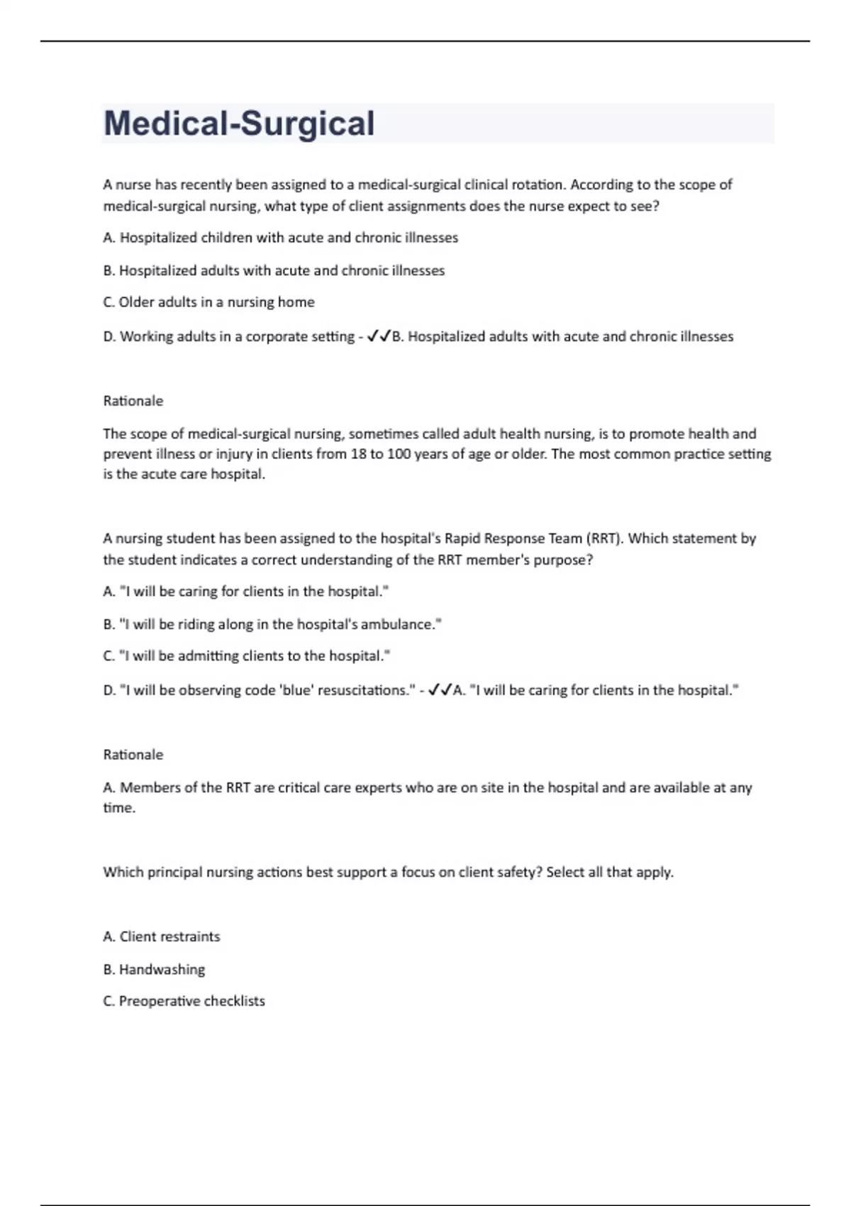A nurse has recently been assigned to a medical-surgical clinical rotation. According to the scope of medical-surgical nursing, what type of client assignments does the nurse expect to see? A. Hospitalized children with acute and chronic illnesses B. Hospitalized adults with acute and chronic illnesses C. Older adults in a nursing home D. Working adults in a corporate setting - B. Hospitalized adults with acute and chronic illnesses Rationale The scope of medical-surgical nursing, sometimes called adult health nursing, is to promote health and prevent illness or injury in clients from 18 to 100 years of age or older. The most common practice setting is the acute care hospital. A nursing student has been assigned to the hospital's Rapid Response Team (RRT). Which statement by the student indicates a correct understanding of the RRT member's purpose? A. "I will be caring for clients in the hospital." B. "I will be riding along in the hospital's ambulance." C. "I will be admitting clients to the hospital." D. "I will be observing code 'blue' resuscitations." - A. "I will be caring for clients in the hospital." Rationale A. Members of the RRT are critical care experts who are on site in the hospital and are available at any time. Which principal nursing actions best support a focus on client safety? Select all that apply. A. Client restraints B. Handwashing C. Preoperative checklists