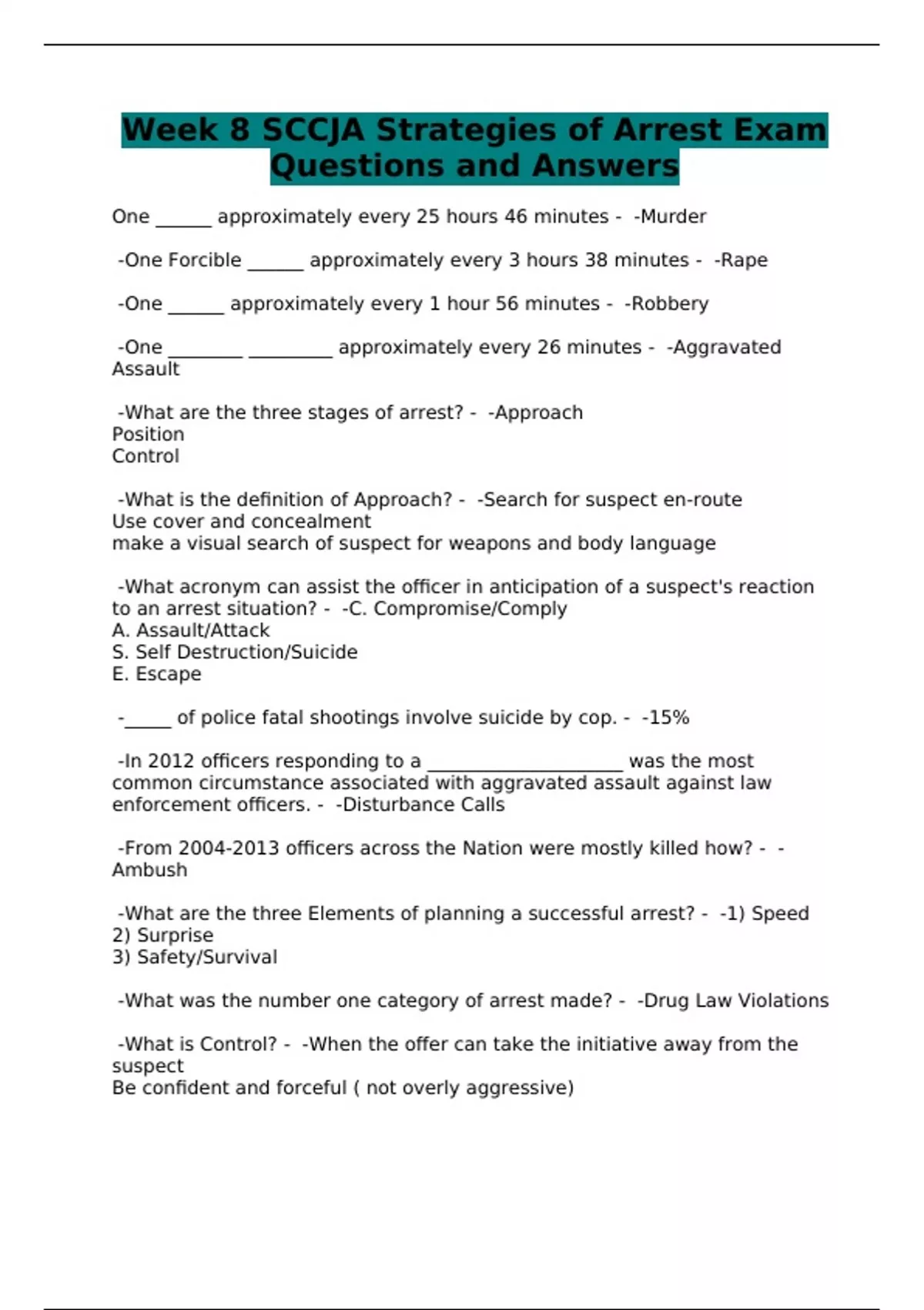 Week 8 SCCJA Strategies of Arrest Exam Questions and Answers
