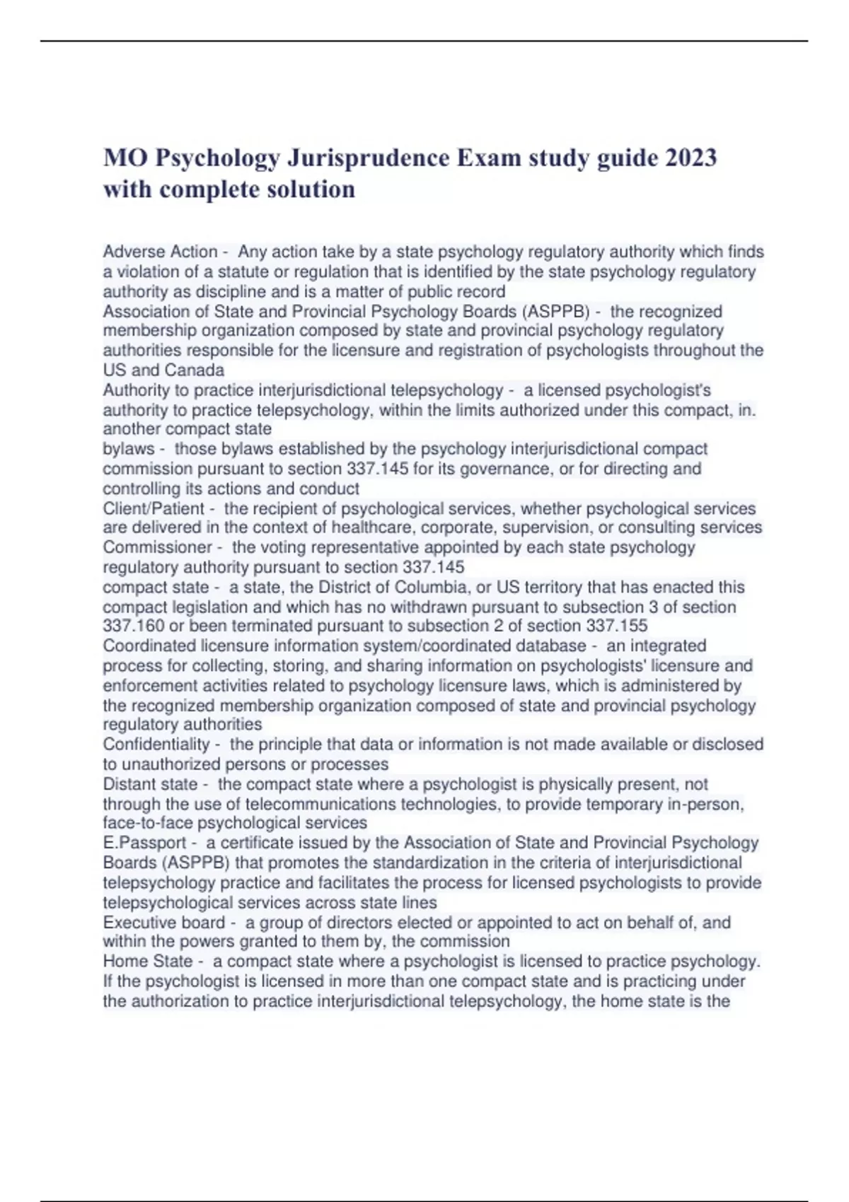 MO Psychology Jurisprudence Exam study guide 2023 with complete solution Adverse Action - Any action take by a state psychology regulatory authority which finds a violation of a statute or regulation that is identified by the state psychology regulatory authority as discipline and is a matter of public record Association of State and Provincial Psychology Boards (ASPPB) - the recognized membership organization composed by state and provincial psychology regulatory authorities responsible for the licensure and registration of psychologists throughout the US and Canada Authority to practice interjurisdictional telepsychology - a licensed psychologist's authority to practice telepsychology, within the limits authorized under this compact, in. another compact state bylaws - those bylaws established by the psychology interjurisdictional compact commission pursuant to section 337.145 for its governance, or for directing and controlling its actions and conduct Client/Patient - the recipient of psychological services, whether psychological services are delivered in the context of healthcare, corporate, supervision, or consulting services Commissioner - the voting representative appointed by each state psychology regulatory authority pursuant to section 337.145 compact state - a state, the District of Columbia, or US territory that has enacted this compact legislation and which has no withdrawn pursuant to subsection 3 of section 337.160 or been terminated pursuant to subsection 2 of section 337.155 Coordinated licensure information system/coordinated database - an integrated process for collecting, storing, and sharing information on psychologists' licensure and enforcement activities related to psychology licensure laws, which is administered by the recognized membership organization composed of state and provincial psychology regulatory authorities Confidentiality - the principle that data or information is not made available or disclosed to unauthorized persons or processes Distant state - the compact state where a psychologist is physically present, not through the use of telecommunications technologies, to provide temporary in-person, face-to-face psychological services E.Passport - a certificate issued by the Association of State and Provincial Psychology Boards (ASPPB) that promotes the standardization in the criteria of interjurisdictional telepsychology practice and facilitates the process for licensed psychologists to provide telepsychological services across state lines Executive board - a group of directors elected or appointed to act on behalf of, and within the powers granted to them by, the commission Home State - a compact state where a psychologist is licensed to practice psychology. If the psychologist is licensed in more than one compact state and is practicing under the authorization to practice interjurisdictional telepsychology, the home state is the compact state where the psychologist is physically present when the telepsychological services are delivered. If the psychologist is licensed in more than one compact state and is practicing under the temporary authorization to practice, the home state is any compact state where the psychologist is licensed; Identity history summary - a summary of information retained by the Federal Bureau of Investigation, or other designee with similar authority, in connection with arrests and, in some instances, federal employment, naturalization, or military service in-person, face-to-face - interactions in which the psychologist and the client/patient are in the same physical space and which does not include interactions that may occur through the use of telecommunication technologies Interjurisdictional practice certificate (IPC - a certificate issued by the Association of State and Provincial Psychology Boards (ASPPB) that grants temporary authority to practice based on notification to the state psychology regulatory authority of intention to practice temporarily, and verification of one's qualifications for such practice; License - authorization by a state psychology regulatory authority to engage in the independent practice of psychology, which would be unlawful without the authorization Receiving state - a compact state where the client/patient is physically located when the telepsychological services are delivered Significant investigatory information - (a) Investigative information that a state psychology regulatory authority, after a preliminary inquiry that includes notification and an opportunity to respond if required by state law, has reason to believe, if proven true, would indicate more than a violation of state statute or ethics code that would be considered more substantial than minor infraction; or (b) Investigative information that indicates that the psychologist represents an immediate threat to public health and safety regardless of whether the psychologist has been notified and had an opportunity to respond Temporary in-person, face-to-face practice - where a psychologist is physically present, not through the use of telecommunications technologies, in the distant state to provide for the practice of psychology for thirty days within a calendar year and based on notification to the distant state. how long must written records be kept? - the psychologist shall assure that all data entries in the professional records are maintained for a period of not fewer than five (5) years after the last date of service rendered, or not less than the time required by other regulations, if that is longer. multiple relationships: Impaired Psychologist - The psychologist shall not undertake or continue a professional relationship with a client when the competency of the psychologist, is or could reasonably be expected to be impaired due to mental, emotional, physiologic, pharmacologic or substance abuse conditions. If a condition develops after a professional relationship has been initiated, the psychologist shall terminate the relation