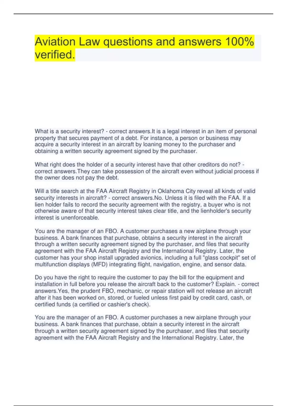 Aviation Law questions and answers 100% verified. What is a security interest? - correct answers.It is a legal interest in an item of personal property that secures payment of a debt. For instance, a person or business may acquire a security interest in an aircraft by loaning money to the purchaser and obtaining a written security agreement signed by the purchaser. What right does the holder of a security interest have that other creditors do not? - correct answers.They can take possession of the aircraft even without judicial process if the owner does not pay the debt. Will a title search at the FAA Aircraft Registry in Oklahoma City reveal all kinds of valid security interests in aircraft? - correct answers.No. Unless it is filed with the FAA. If a lien holder fails to record the security agreement with the registry, a buyer who is not otherwise aware of that security interest takes clear title, and the lienholder's security interest is unenforceable. You are the manager of an FBO. A customer purchases a new airplane through your business. A bank finances that purchase, obtains a security interest in the aircraft through a written security agreement signed by the purchaser, and files that security agreement with the FAA Aircraft Registry and the International Registry. Later, the customer has your shop install upgraded avionics, including a full "glass cockpit" set of multifunction displays (MFD) integrating flight, navigation, engine, and sensor data. Do you have the right to require the customer to pay the bill for the equipment and installation in full before you release the aircraft back to the customer? Explain. - correct answers.Yes, the prudent FBO, mechanic, or repair station will not release an aircraft after it has been worked on, stored, or fueled unless first paid by credit card, cash, or certified funds (a certified or cashier's check). You are the manager of an FBO. A customer purchases a new airplane through your business. A bank finances that purchase, obtain a security interest in the aircraft through a written security agreement signed by the purchaser, and files that security agreement with the FAA Aircraft Registry and the International Registry. Later, the customer has your shop install upgraded avionics, including a full "glass cockpit" set of multifunction displays (MFD) integrating flight, navigation, engine, and sensor data. If the aircraft owner went bankrupt at that point (when the work has been done, the bill has not been paid, and the FBO still has the aircraft), who will be paid first from the sale of the aircraft, the FBO or the bank? Why? - correct answers.The person having possession of the aircraft under possessory lien for parts, labor, materials, or services has first priority and is entitled to be paid in full from the proceeds of the sale before any other lienholder. This is an example of the old adage "possession in nine-tenths of the law." You are the manager of an FBO. A customer purchases a new airplane through your business. A bank finances that purchase, obtain a security interest in the aircraft through a written security agreement signed by the purchaser, and files that security agreement with the FAA Aircraft Registry and the International Registry. Later, the customer has your shop install upgraded avionics, including a full "glass cockpit" set of multifunction displays (MFD) integrating flight, navigation, engine, and sensor data. In initial discussions over the price of the equipment and installation, the customer indicates that she wants to buy the unit and have your shop install it, but she would like to pay the price for the equipment and installation in three equal monthly payments, rather than all at once. This is acceptable to you. Is there anything you can require as a condition of releasing the aircraft back to its owner before the debt is paid in full to protect the FBO's security interest in the aircraft for this installation? If so, describe. - correct answers.However, if for some reason the business wishes (as to accommodate a long-time good customer claiming a temporary cash shortage), it may have the aircraft owner sign a promissory note for the amount due, secured interest in the aircraft. Those documents should then be immediately filed with the FAA Aircraft Registry. It the aircraft is released without these, the lien is extinguished, but by following this procedure, the lien is preserved (although at a lower priority, behind other previously recorded security interest). You are the manager of an FBO. A customer purchases a new airplane through your business. A bank finances that purchase, obtains a security interest in the aircraft through a written security agreement signed by the purchaser, and files that security agreement with the FAA Aircraft Registry and the International Registry. Later, the customer has your shop install upgraded avionics, including a full "glass cockpit" set of multifunction displays (MFD) integrating flight, navigation, engine, and sensor data. After the transaction described in c, above, your shop installs the equipment in the aircraft and releases it to the owner. Before the bill is paid, the aircraft owner files bankruptcy. Now who is in the superior position to be paid first out of the proceeds of the sale of the aircraft: the FBO or the bank? Explain. - correct answers.The bank, because the FBO does not have the aircraft in hand so the bank must repossess the plane and sell it therefore they have priority. You are an aircraft broker specializing in airline-size jets. A customer contacts you, indicating that he is the chief executive officer of an international cattle-breeding operation based in Texas. He advises you that neither he nor anyone on his staff knows much about large airplanes, but they need to purchase an aircraft capable of transporting 100 bulls weighing an average of 1,600 pounds each, each in a 150-pound shipping cage measuring 5 feet wide by 8 feet long by 6 feet high. H