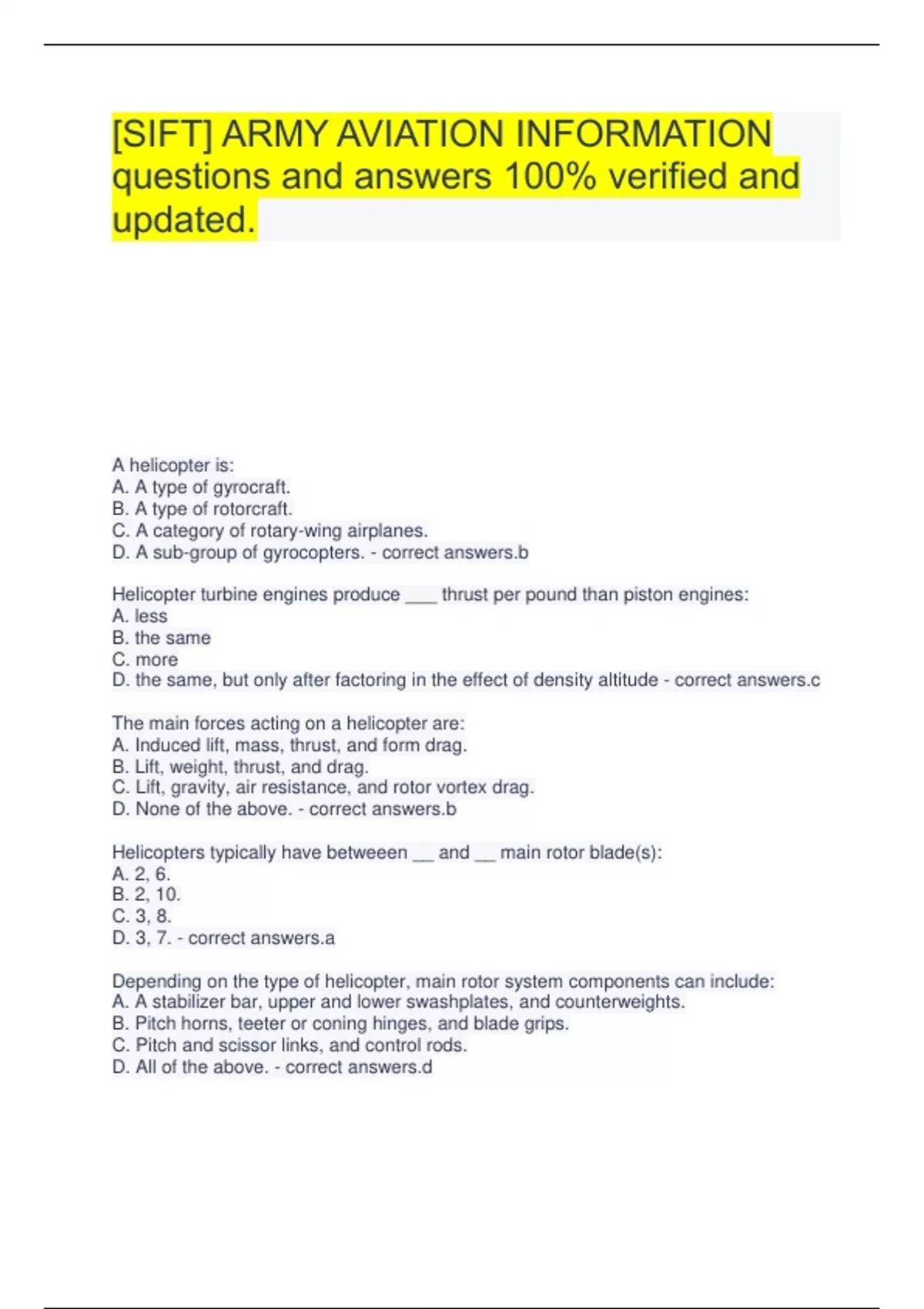 [SIFT] ARMY AVIATION INFORMATION questions and answers 100% verified and updated. A helicopter is: A. A type of gyrocraft. B. A type of rotorcraft. C. A category of rotary-wing airplanes. D. A sub-group of gyrocopters. - correct answers.b Helicopter turbine engines produce ___ thrust per pound than piston engines: A. less B. the same C. more D. the same, but only after factoring in the effect of density altitude - correct answers.c The main forces acting on a helicopter are: A. Induced lift, mass, thrust, and form drag. B. Lift, weight, thrust, and drag. C. Lift, gravity, air resistance, and rotor vortex drag. D. None of the above. - correct answers.b Helicopters typically have betweeen __ and __ main rotor blade(s): A. 2, 6. B. 2, 10. C. 3, 8. D. 3, 7. - correct answers.a Depending on the type of helicopter, main rotor system components can include: A. A stabilizer bar, upper and lower swashplates, and counterweights. B. Pitch horns, teeter or coning hinges, and blade grips. C. Pitch and scissor links, and control rods. D. All of the above. - correct answers.d The function of the flybar is: A. To decrease crosswind thrust on the blades and enhance flight stability by keeping the bar stable as the rotor spins. B. To increase crosswind thrust and modify flight stability by allowing the bar to spin at a slower speed than the main rotor. C. To decrease crosswind thrust and augment flight stability by maintaining the bar at an acute angle to the main rotor. D. To spin in a direction opposite to the main rotor's, thereby reducing induced drag. - correct answers.a Many helicopters have a horizontal stabilizer located: A. On the mast. B. On the tail boom. C. On the fin. D. None of the above. - correct answers.b The purpose of the tail rotor is: A. To create kinetic energy that is transformed into potential energy as the helicopter climbs. B. To produce rotational momentum that is used by the transmission to drive a generator. C. To produce an anti-torque force acting perpendicular to the helicopter's longitudinal axis. D. All of the above. - correct answers.c Wheels on ___ types of helicopters are ___: A. all, retractable (to reduce drag). B. some, supplementary to skids. C. some, retractable. D. all, supplementary to skids. - correct answers.c A pilot controls a helicopter using: A. Flight instruments, hydraulic actuators, and a cyclic with a twist throttle. B. Flight instruments, pedals, two or more throttle levers, and avionics. C. Pedals, a throttle with a twist grip, collective link rods, and a cyclic. D. Pedals, and a collective, throttle, and cyclic. - correct answers.d From a physics perspective, the ___ force is deemed to act through a helicopter's ___: A. lift, center of motion. B. total weight, center of gravity. C. induced drag, longitudinal axis. D. total mass, center of motion. - correct answers.b When a pilot banks a helicopter, causing it to turn, ___: A. The machine's weight increases. B. The machine's weight decreases.