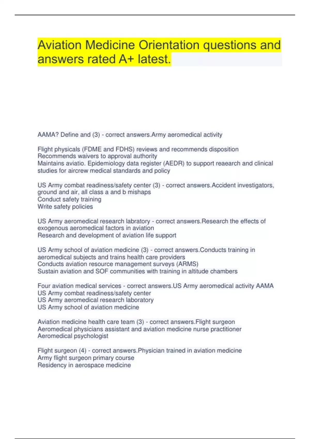 Aviation Medicine Orientation questions and answers rated A+ latest. AAMA? Define and (3) - correct answers.Army aeromedical activity Flight physicals (FDME and FDHS) reviews and recommends disposition Recommends waivers to approval authority Maintains aviatio. Epidemiology data register (AEDR) to support reaearch and clinical studies for aircrew medical standards and policy US Army combat readiness/safety center (3) - correct answers.Accident investigators, ground and air, all class a and b mishaps Conduct safety training Write safety policies US Army aeromedical research labratory - correct answers.Research the effects of exogenous aeromedical factors in aviation Research and development of aviation life support US Army school of aviation medicine (3) - correct answers.Conducts training in aeromedical subjects and trains health care providers Conducts aviation resource management surveys (ARMS) Sustain aviation and SOF communities with training in altitude chambers Four aviation medical services - correct answers.US Army aeromedical activity AAMA US Army combat readiness/safety center US Army aeromedical research laboratory US Army school of aviation medicine Aviation medicine health care team (3) - correct answers.Flight surgeon Aeromedical physicians assistant and aviation medicine nurse practitioner Aeromedical psychologist Flight surgeon (4) - correct answers.Physician trained in aviation medicine Army flight surgeon primary course Residency in aerospace medicine Rated crewmember APA and AMNP (4) - correct answers.Trained in aviation medicine Army flight surgeon primary course Supervised by a flight surgeon Non rated, noncrewmember Aeromedical psychologist (9) - correct answers.Trained in clinical psychology Aeromedical psychology course Works with FS, APA and AMNP Non rated noncrewmember Consultant for CO, FS, APA and AMNP Human factors subject matter expert Stress and fatigue SME Flight evaluation boards Accident investigation boards Healthcare team duties and responsibilities (5) - correct answers.Preventative medicine Clinical medicine Unit readiness Staff function Hospital support Aviation medicine program (3) - correct answers.Designed to promote and maintain the aviation fighting force through health promotion and sustainment of the mental and physical well being of aviation personnel Traditionally to deliver clinical and operational preventative medicine services PRIMARY GOAL IS PREVENTATIVE MEDICINE Flying duty medical exam FDME (4) - correct answers.Periodic screening medical exam Starting point for all aircrew members Promotes and preserves the fitness, deployability and safety of aviation personnel Two types-initial (18 months) and comprehensive (rucker up to 24 months) Initial FDME (3) - correct answers.Performed for accession purposes Classes 1-4 Valid for 18 months Comprehensive FDME (4) - correct answers.Retention exam Performed every 5 years Performed annually at 50 yo Performed after any class a or b mishap Four classes of FDME - correct answers.(1) wonnabe pilots