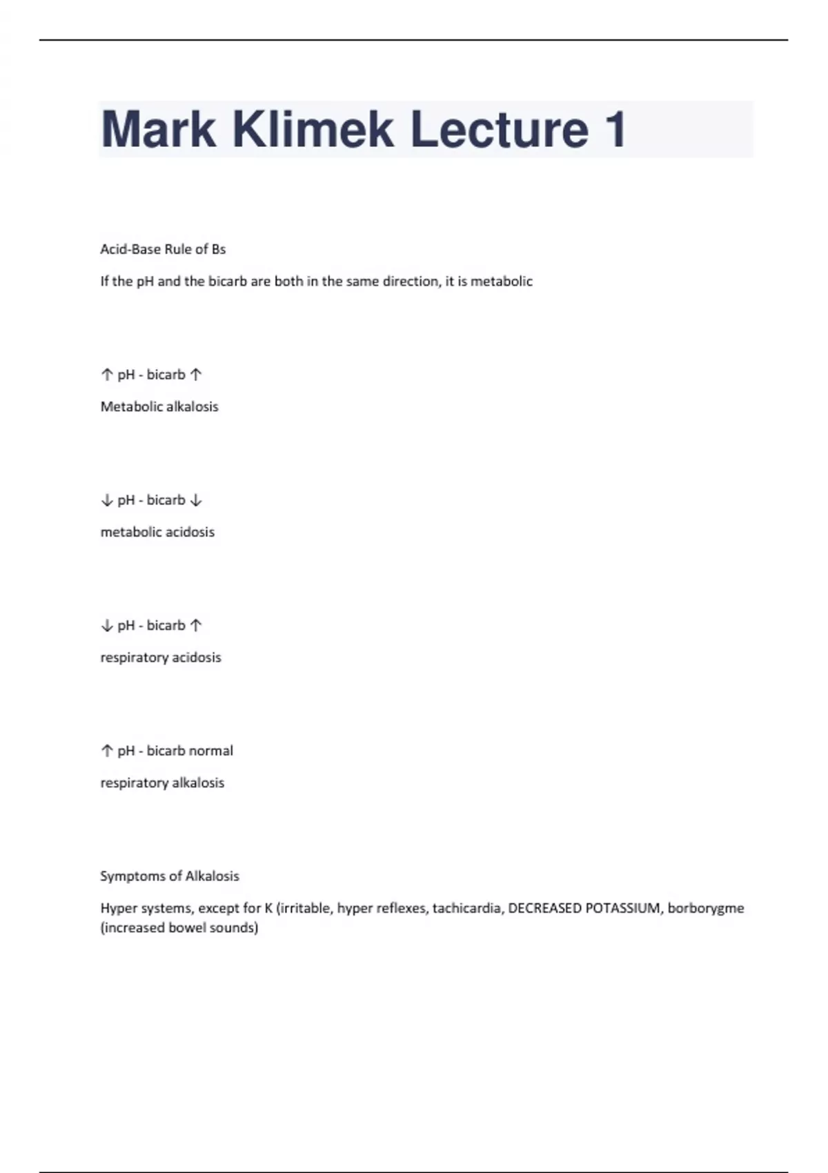 Mark Klimek Lecture 1 Acid-Base Rule of Bs If the pH and the bicarb are b