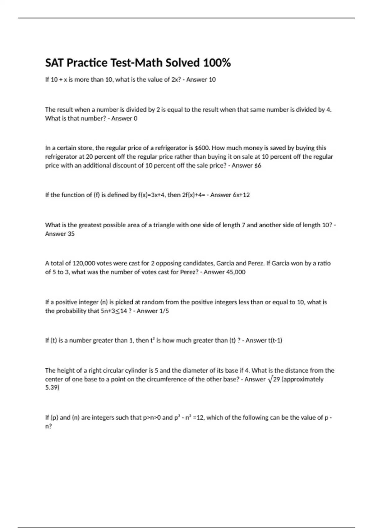 If 10 + x is more than 10, what is the value of 2x? - Answer 10 The result when a number is divided by 2 is equal to the result when that same number is divided by 4. What is that number? - Answer 0 In a certain store, the regular price of a refrigerator is $600. How much money is saved by buying this refrigerator at 20 percent off the regular price rather than buying it on sale at 10 percent off the regular price with an additional discount of 10 percent off the sale price? - Answer $6 If the function of (f) is defined by f(x)=3x+4, then 2f(x)+4= - Answer 6x+12 What is the greatest possible area of a triangle with one side of length 7 and another side of length 10? - Answer 35 A total of 120,000 votes were cast for 2 opposing candidates, Garcia and Perez. If Garcia won by a ratio of 5 to 3, what was the number of votes cast for Perez? - Answer 45,000 If a positive integer (n) is picked at random from the positive integers less than or equal to 10, what is the probability that 5n+3≤14 ? - Answer 1/5 If (t) is a number greater than 1, then t² is how much greater than (t) ? - Answer t(t-1) The height of a right circular cylinder is 5 and the diameter of its base if 4. What is the distance from the center of one base to a point on the circumference of the other base? - Answer √29 (approximately 5.39) If (p) and (n) are integers such that p>n>0 and p² - n² =12, which of the following can be the value of p - n? I. 1 II. 2 III. 4 - Answer II only
